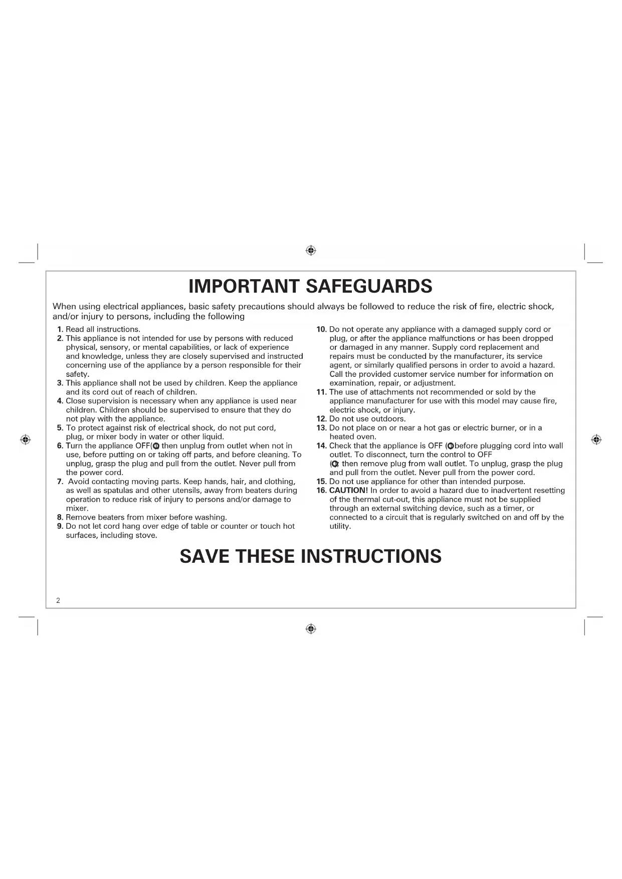 Other Consumer Safety Information This appliance is intended for household use only. w WARNING Electrical Shock Hazard: This appliance is provided with a polarized plug (one wide blade) to reduce the risk of electric shock. The plug fits only one way into a polarized outlet. Do not defeat the safety purpose of the plug by modifying the plug in any way or by using an adapter. If the plug does not fit fully into the outlet, reverse the plug. If it still does not fit, have an electrician replace the outlet. The length of the cord used on this appliance was selected to reduce the hazards of becoming tangled in or tripping over a longer cord. If a longer cord is necessary, an approved extension cord may be used. The electrical rating of the extension cord must be equal to or greater than the rating of the appliance. Care must be taken to arrange the extension cord so that it will not drape over the countertop or tabletop where it can be pulled on by children or accidentally tripped over. w WARNING Moving Parts Hazard. To reduce the risk of personal injury, always unplug mixer before inserting or removing beaters.