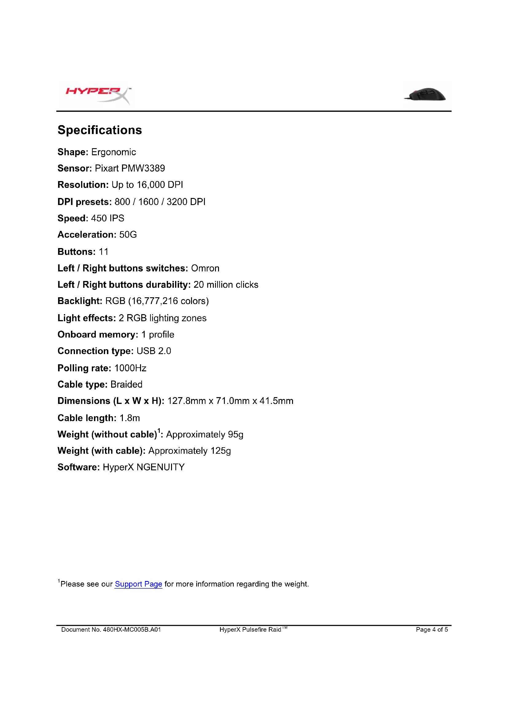 Please see our Support Page for more information regarding the weight.Document No. 480HX-MC005B.A01 HyperX Pulsefire Raid