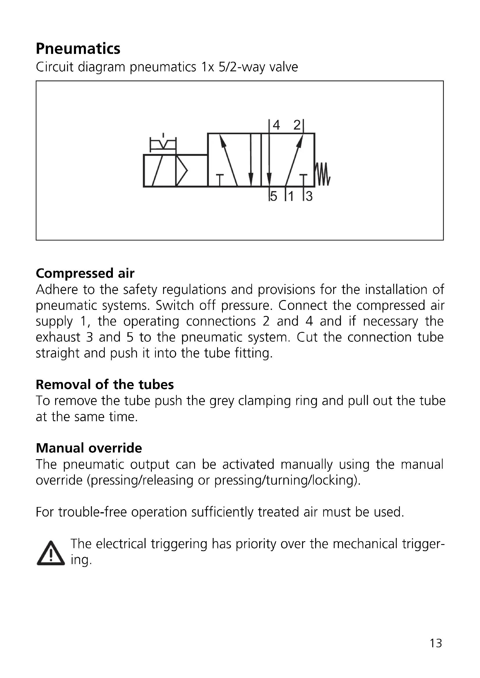 I-3/4 I-4Pneumatics Circuit diagram pneumatics 1x 5/2-way valve Compressed air Adhere to the safety regulations and provisions for the installation of pneumatic systems. Switch off pressure. Connect the compressed air supply 1, the operating connections 2 and 4 and if necessary the exhaust 3 and 5 to the pneumatic system. Cut the connection tube straight and push it into the tube fitting. Removal of the tubes To remove the tube push the grey clamping ring and pull out the tube at the same time. Manual override The pneumatic output can be activated manually using the manual override (pressing/releasing or pressing/turning/locking). For trouble-free operation sufficiently treated air must be used. The electrical triggering has priority over the mechanical trigger- ing.