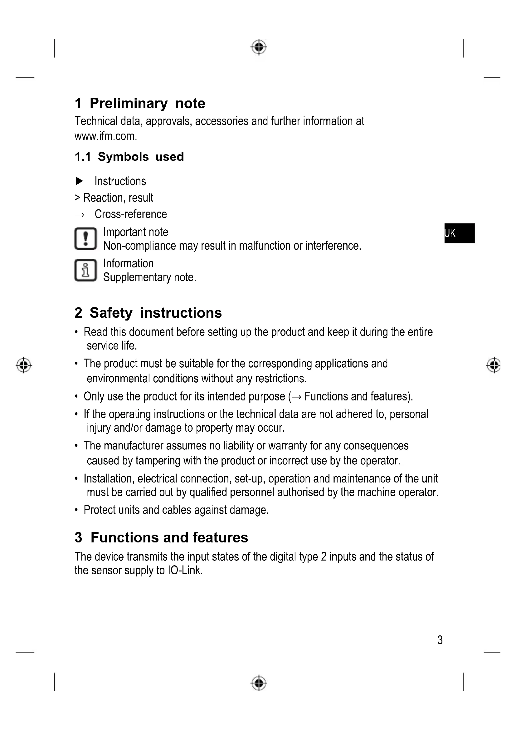 1 Preliminary note Technical data, approvals, accessories and further information at www.ifm.com.