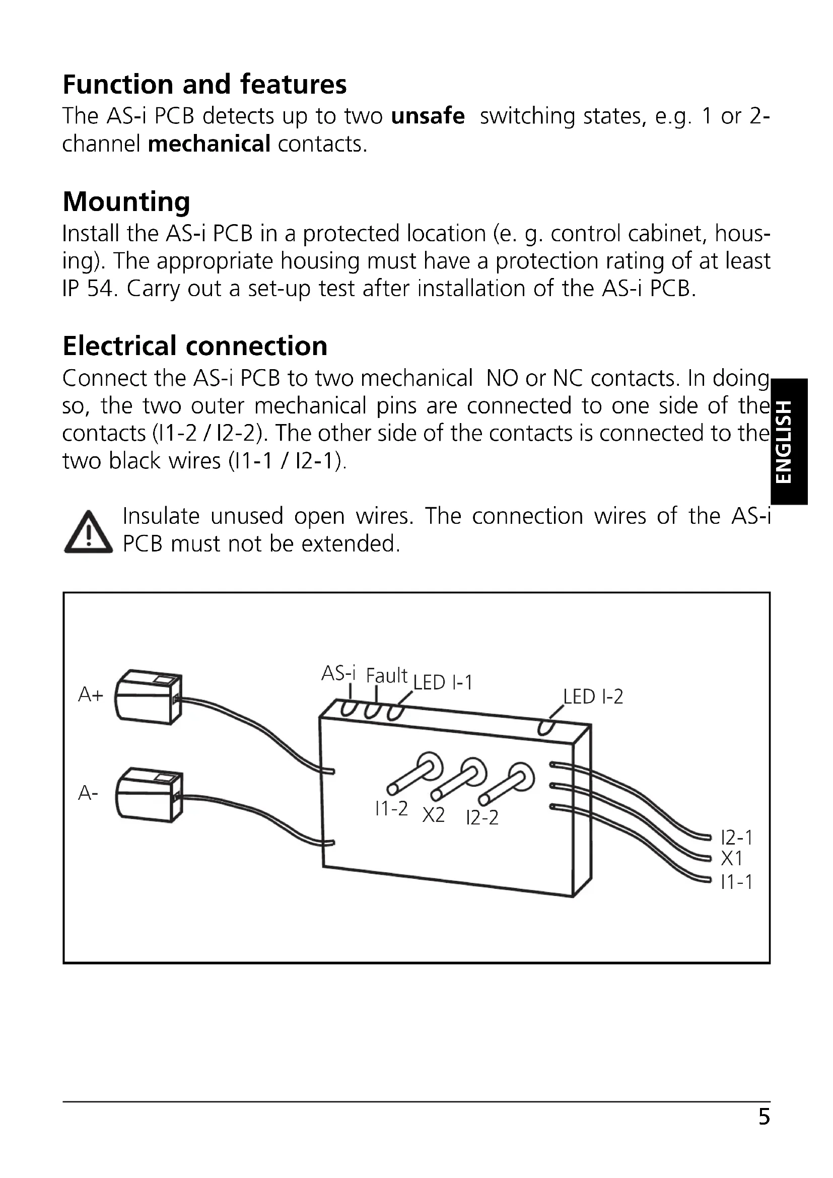9 10 10Function and features The AS-i PCB detects up to two unsafe switching states, e.g. 1 or 2- channel mechanical contacts. Mounting Install the AS-i PCB in a protected location (e. g. control cabinet, hous- ing). The appropriate housing must have a protection rating of at least IP 54. Carry out a set-up test after installation of the AS-i PCB. Electrical connection Connect the AS-i PCB to two mechanical NO or NC contacts. In doing so, the two outer mechanical pins are connected to one side of the contacts (I1-2 / I2-2). The other side of the contacts is connected to the two black wires (I1-1 / I2-1). Insulate unused open wires. The connection wires of the AS-i PCB must not be extended. ENGLISH