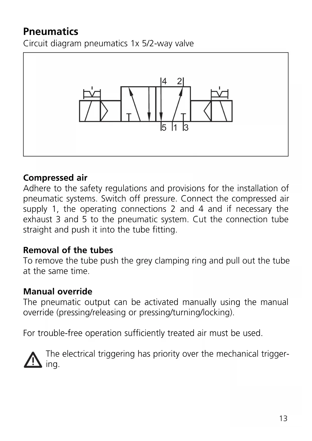 I-3/4 I-4Pneumatics Circuit diagram pneumatics 1x 5/2-way valve Compressed air Adhere to the safety regulations and provisions for the installation of pneumatic systems. Switch off pressure. Connect the compressed air supply 1, the operating connections 2 and 4 and if necessary the exhaust 3 and 5 to the pneumatic system. Cut the connection tube straight and push it into the tube fitting. Removal of the tubes To remove the tube push the grey clamping ring and pull out the tube at the same time. Manual override The pneumatic output can be activated manually using the manual override (pressing/releasing or pressing/turning/locking). For trouble-free operation sufficiently treated air must be used. The electrical triggering has priority over the mechanical trigger- ing.
