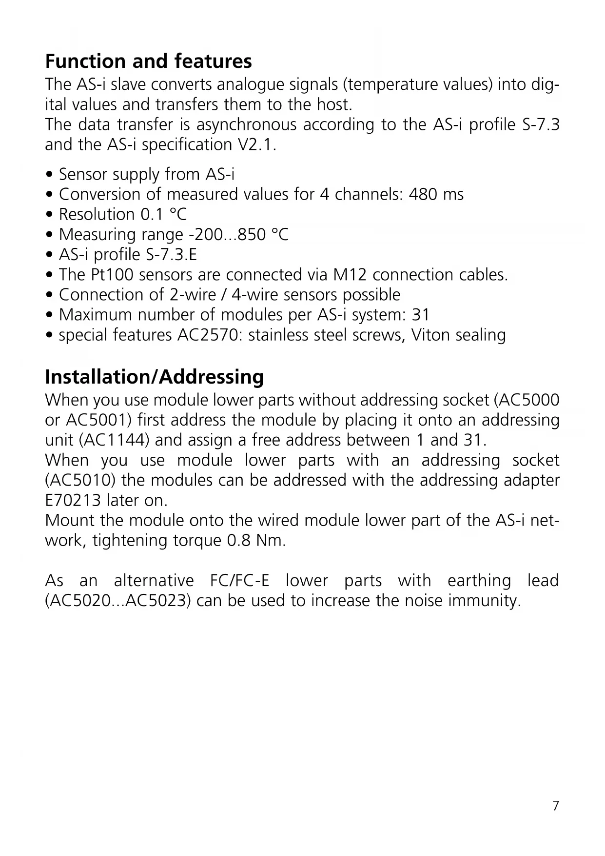 - special features AC2570: stainless steel screws, Viton sealing Installation/Addressing When you use module lower parts without addressing socket (AC5000 or AC5001) first address the module by placing it onto an addressing unit (AC1144) and assign a free address between 1 and 31. When you use module lower parts with an addressing socket (AC5010) the modules can be addressed with the addressing adapter E70213 later on. Mount the module onto the wired module lower part of the AS-i net- work, tightening torque 0.8 Nm. As an alternative FC/FC-E lower parts with earthing lead (AC5020...AC5023) can be used to increase the noise immunity. 7Electrical connection The analogue module is connected to the AS-Interface via the stan- dardised EMS [(supply from AS-i) (also in this case the Pt100 sensors are supplied from the AS-i voltage)]. For all the following wiring diagrams the indicated pin connection refers to the analogue module. Connection of a 2-wire Pt100 element to the AS-i module