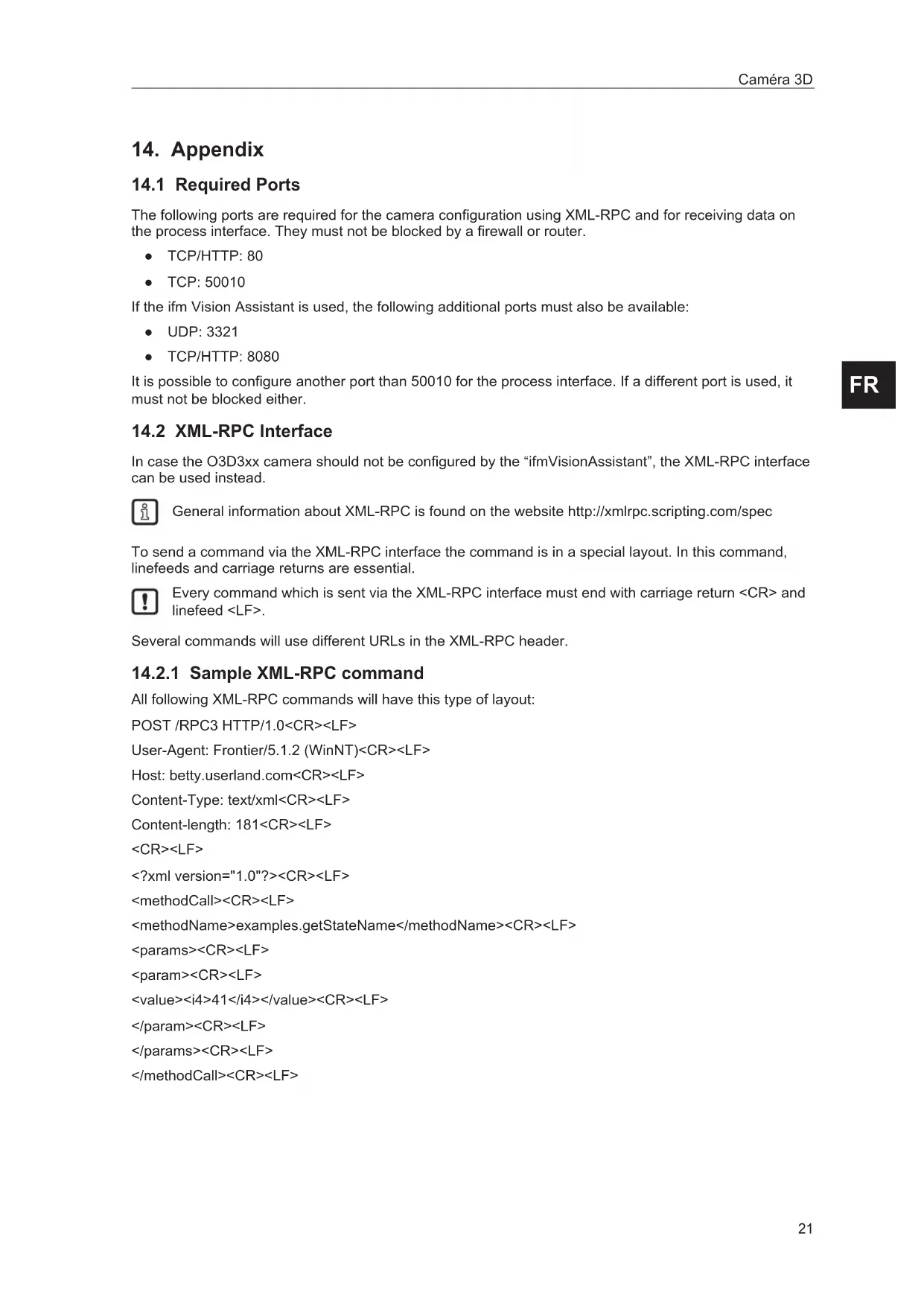 In case the O3D3xx camera should not be configured by the “ifmVisionAssistant”, the XML-RPC interface can be used instead. General information about XML-RPC is found on the website http://xmlrpc.scripting.com/spec To send a command via the XML-RPC interface the command is in a special layout. In this command, linefeeds and carriage returns are essential. Every command which is sent via the XML-RPC interface must end with carriage return <CR> and linefeed <LF>. Several commands will use different URLs in the XML-RPC header.