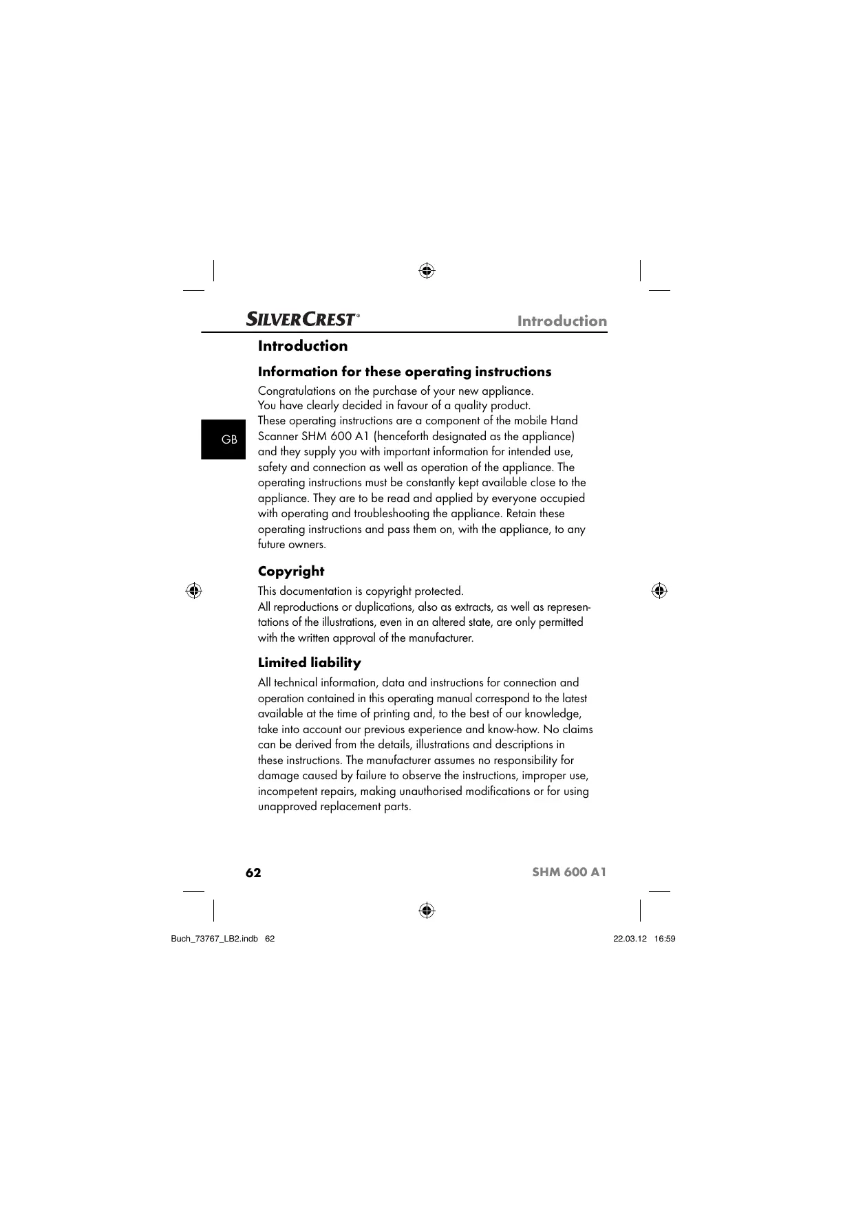 Congratulations on the purchase of your new appliance. You have clearly decided in favour of a quality product. These operating instructions are a component of the mobile Hand Scanner SHM 600 A1 (henceforth designated as the appliance) and they supply you with important information for intended use, safety and connection as well as operation of the appliance. The operating instructions must be constantly kept available close to the appliance. They are to be read and applied by everyone occupied with operating and troubleshooting the appliance. Retain these operating instructions and pass them on, with the appliance, to any future owners. Copyright This documentation is copyright protected. All reproductions or duplications, also as extracts, as well as representations of the illustrations, even in an altered state, are only permitted with the written approval of the manufacturer. Limited liability All technical information, data and instructions for connection and operation contained in this operating manual correspond to the latest available at the time of printing and, to the best of our knowledge, take into account our previous experience and know-how. No claims can be derived from the details, illustrations and descriptions in these instructions. The manufacturer assumes no responsibility for damage caused by failure to observe the instructions, improper use, incompetent repairs, making unauthorised modifications or for using unapproved replacement parts.