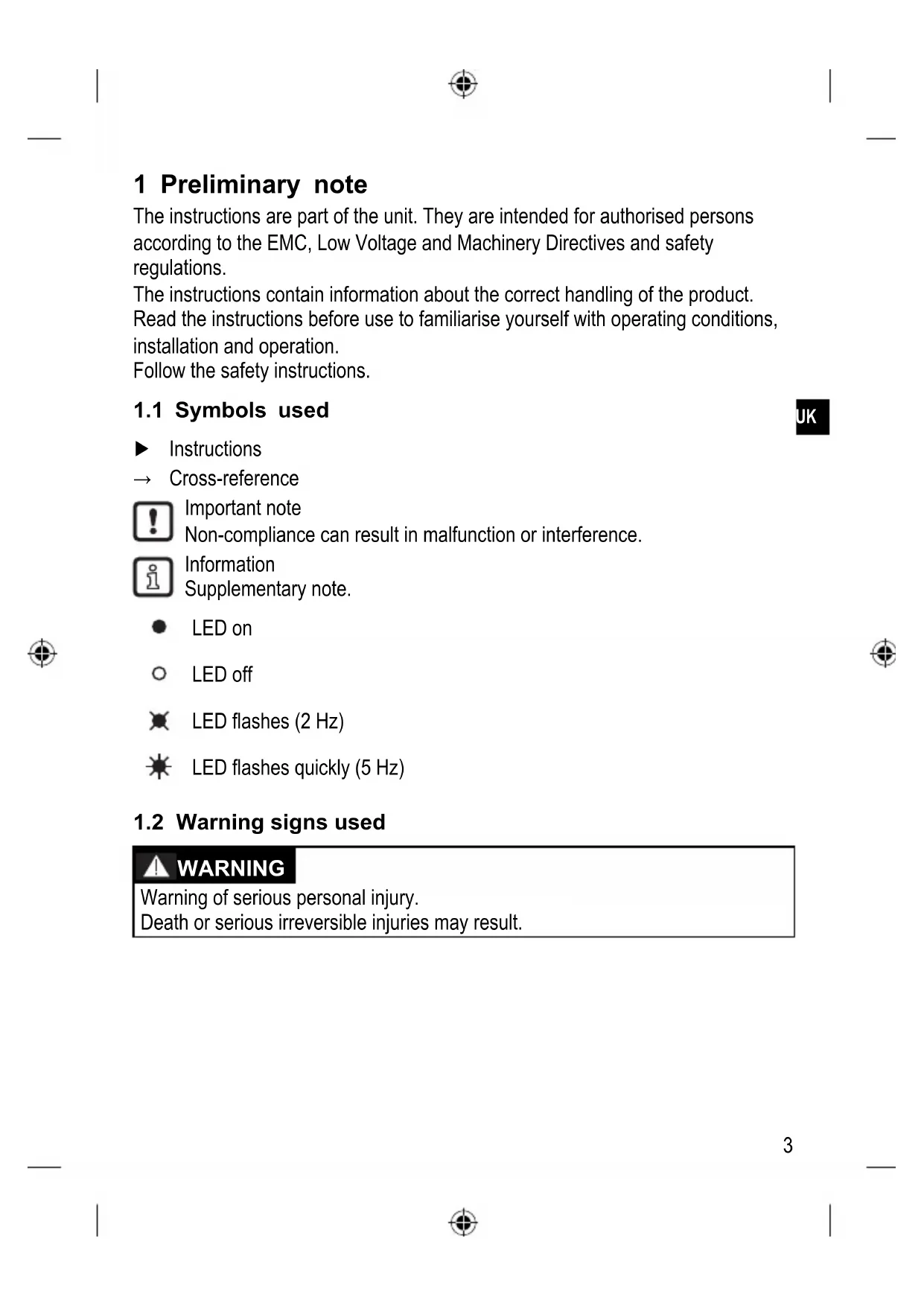 1 Preliminary note The instructions are part of the unit. They are intended for authorised persons according to the EMC, Low Voltage and Machinery Directives and safety regulations. The instructions contain information about the correct handling of the product. Read the instructions before use to familiarise yourself with operating conditions, installation and operation. Follow the safety instructions.