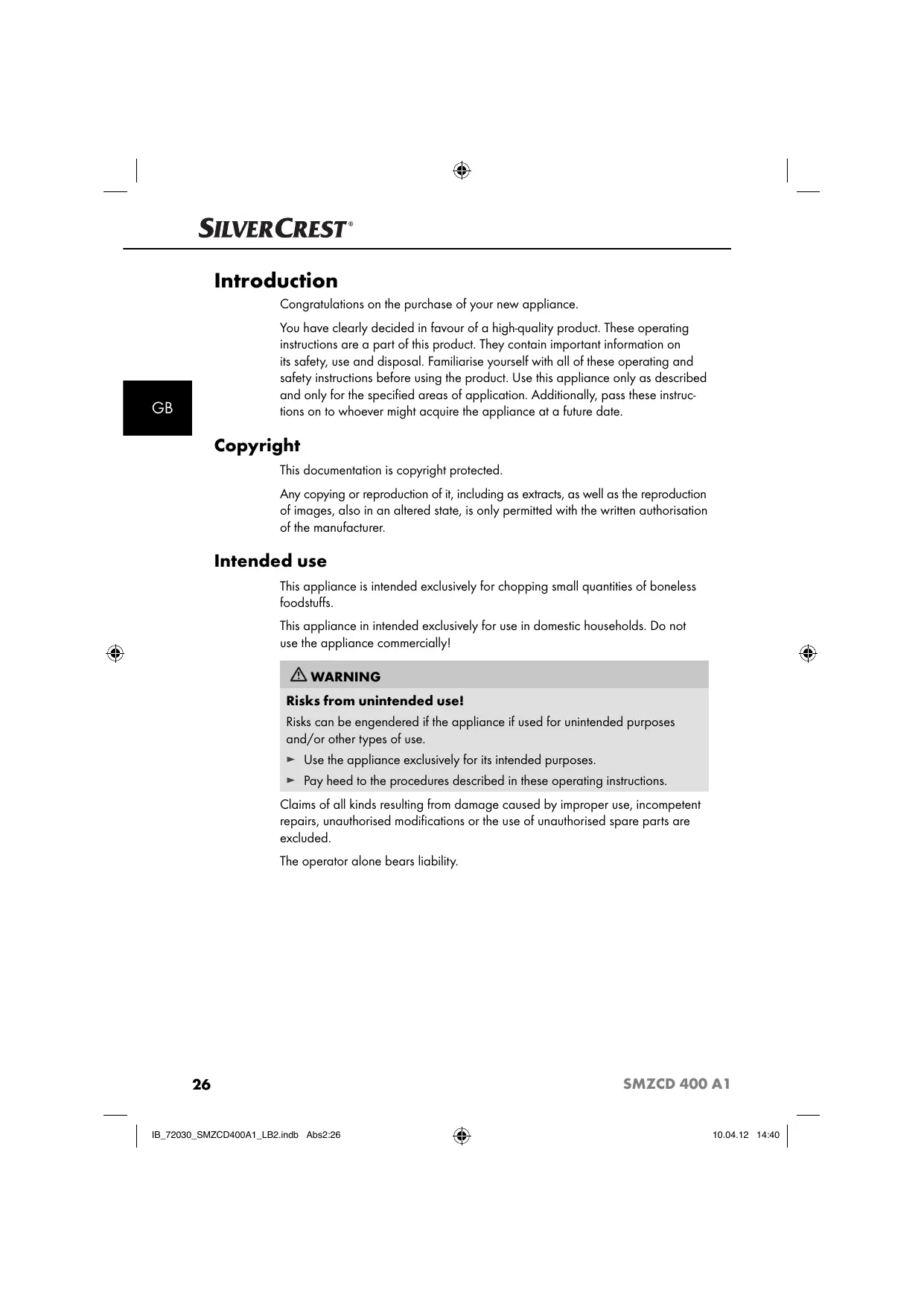 NOTICE ► The warranty covers only material or manufacturing faults, but not for transport damage, normal wear and tear or damage to fragile parts, such as switches. This product is for domestic use only and is not intended for commercial applications. In the event of misuse and improper handling, use of force and interference not carried out by our authorised service branch, the warranty will become void.. Your statutory rights are not restricted in any way by this warranty. The warranty period is not extended by repairs effected under warranty. This applies also to replaced and repaired parts. Damages or defects discovered after purchase are to be reported directly after unpacking, at the latest two days after the purchase date. Repairs carried out after lapse of the warranty period are subject to charge. Service Service Great Britain Tel.: 0871 5000 720 (£ 0.10/Min.) E-Mail: kompernass@lidl.co.uk IAN 72030 SMZCD 400 A1 IB_72030_SMZCD400A1_LB2.indb Abs2:35