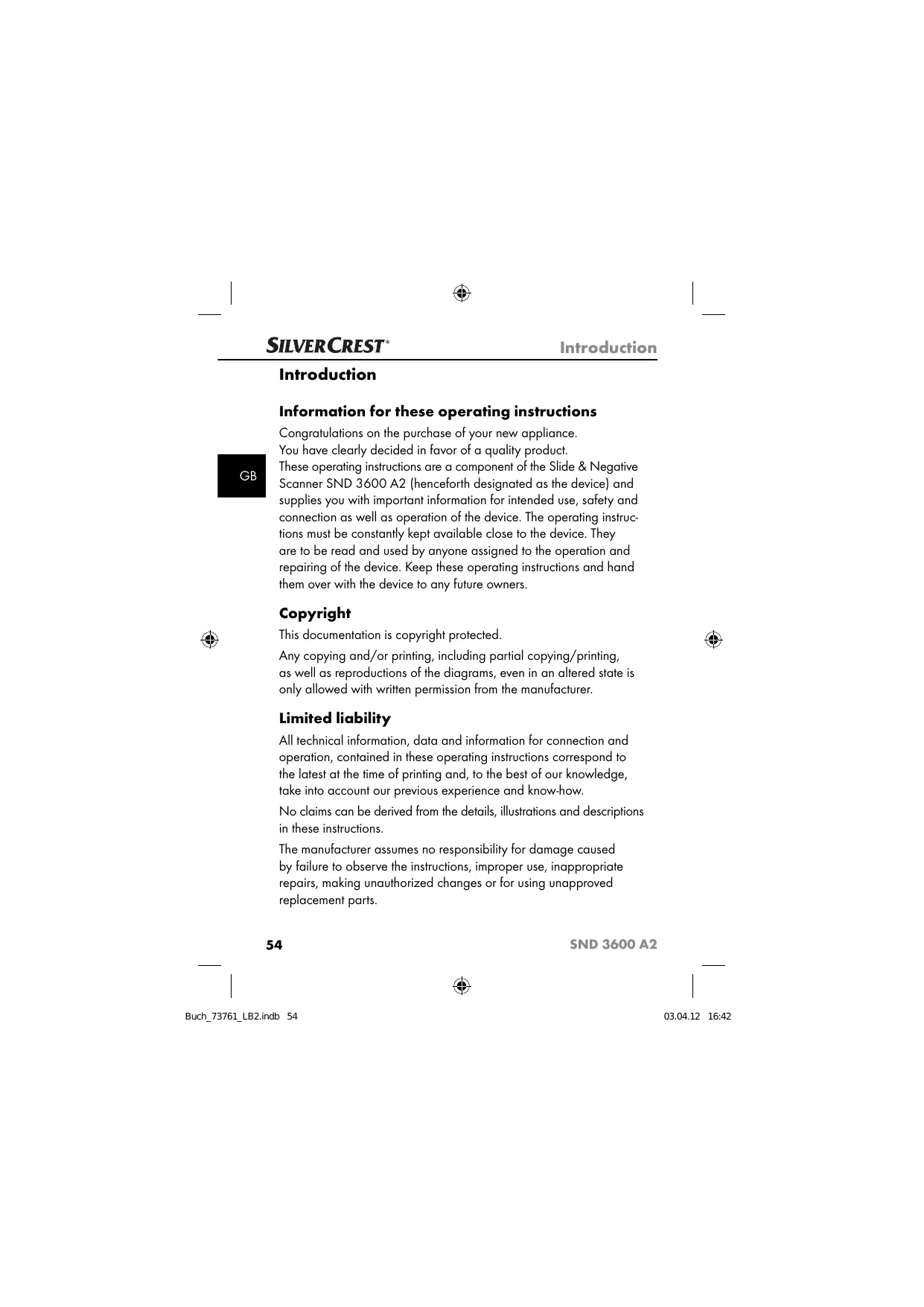 Congratulations on the purchase of your new appliance. You have clearly decided in favor of a quality product. These operating instructions are a component of the Slide & Negative Scanner SND 3600 A2 (henceforth designated as the device) and supplies you with important information for intended use, safety and connection as well as operation of the device. The operating instructions must be constantly kept available close to the device. They are to be read and used by anyone assigned to the operation and repairing of the device. Keep these operating instructions and hand them over with the device to any future owners. Copyright This documentation is copyright protected. Any copying and/or printing, including partial copying/printing, as well as reproductions of the diagrams, even in an altered state is only allowed with written permission from the manufacturer. Limited liability All technical information, data and information for connection and operation, contained in these operating instructions correspond to the latest at the time of printing and, to the best of our knowledge, take into account our previous experience and know-how. No claims can be derived from the details, illustrations and descriptions in these instructions. The manufacturer assumes no responsibility for damage caused by failure to observe the instructions, improper use, inappropriate repairs, making unauthorized changes or for using unapproved replacement parts.