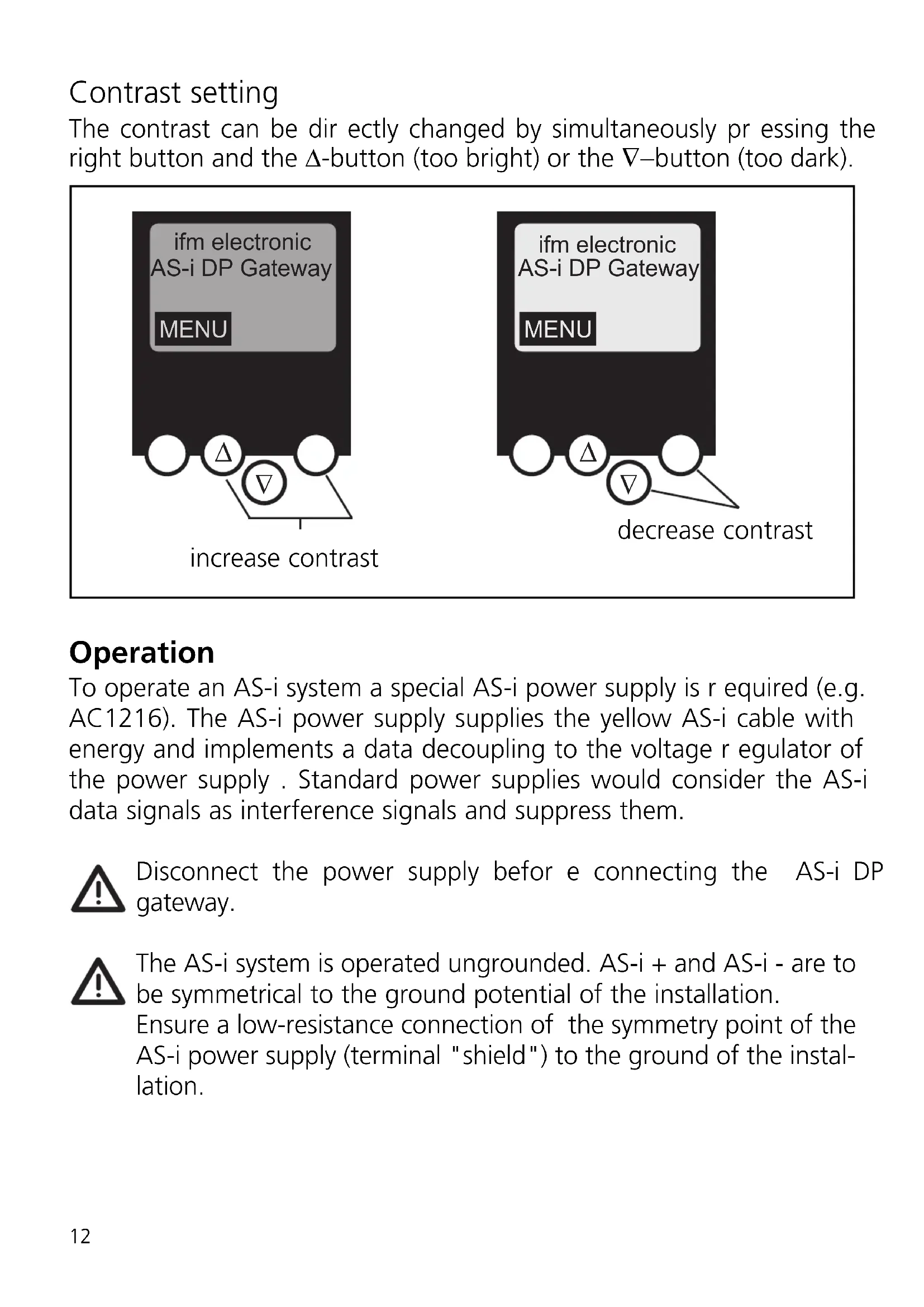 PWR/COM PROJ CONF/PF n. c. BUS FAIL. LED indicators and pin connection Profibus DP interface display pushbuttons FE: functional earthContrast setting The contrast can be dir ectly changed by simultaneously pr essing the right button and the Δ-button (too bright) or the ∇−button (too dark). Operation To operate an AS-i system a special AS-i power supply is r equired (e.g. AC1216). The AS-i power supply supplies the yellow AS-i cable with energy and implements a data decoupling to the voltage r egulator of the power supply . Standard power supplies would consider the AS-i data signals as interference signals and suppress them. Disconnect the power supply befor e connecting the AS-i DP gateway. The AS-i system is operated ungrounded. AS-i + and AS-i - are to be symmetrical to the ground potential of the installation. Ensure a low-resistance connection of the symmetry point of the AS-i power supply (terminal "shield") to the ground of the instal- lation.