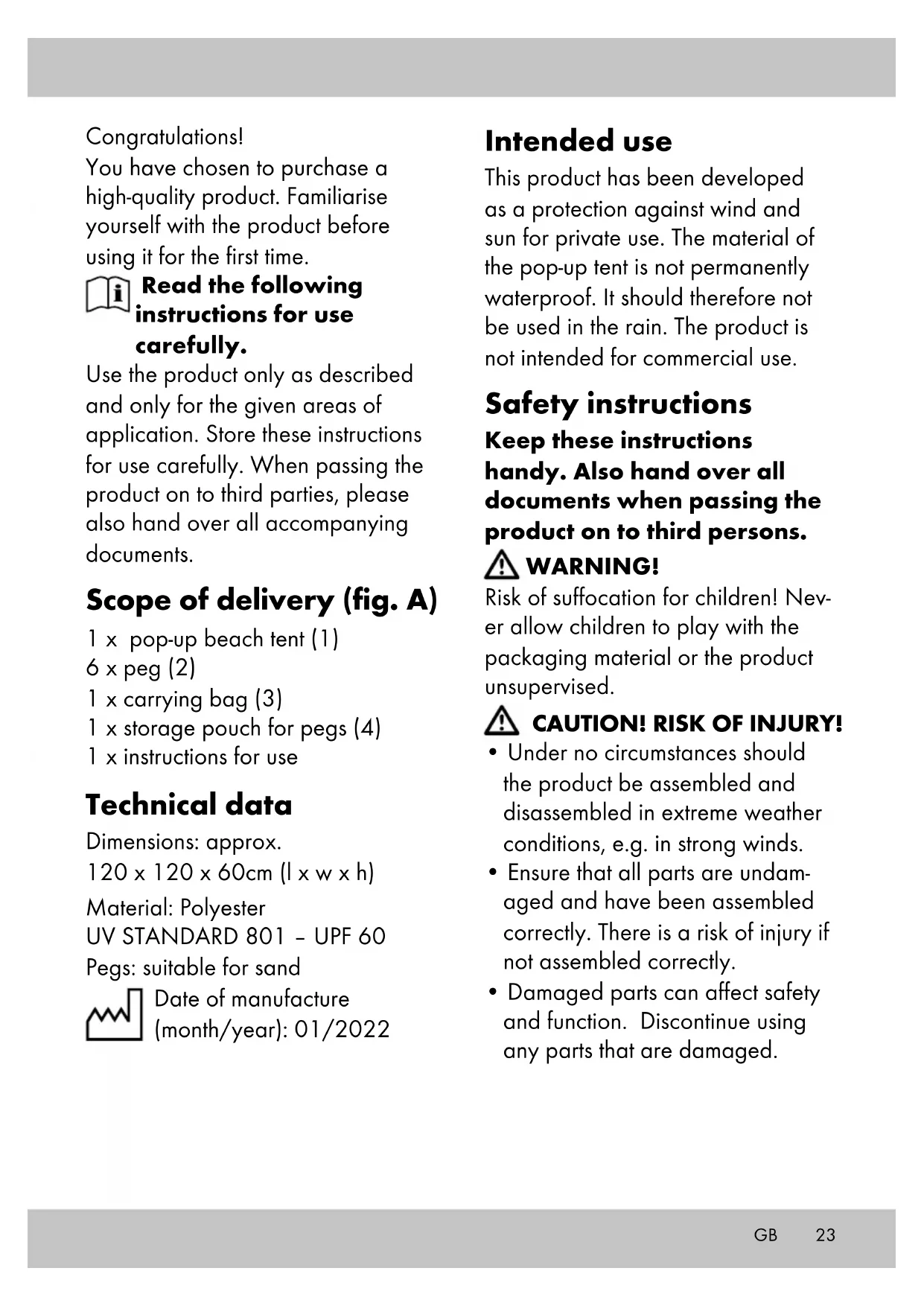 Pegs: suitable for sand Date of manufacture (month/year): 01/2022 Intended use This product has been developed as a protection against wind and sun for private use. The material of the pop-up tent is not permanently waterproof. It should therefore not be used in the rain. The product is not intended for commercial use. Safety instructions Keep these instructions handy. Also hand over all documents when passing the product on to third persons. WARNING! Risk of suffocation for children! Nev- er allow children to play with the packaging material or the product unsupervised. CAUTION! RISK OF INJURY!