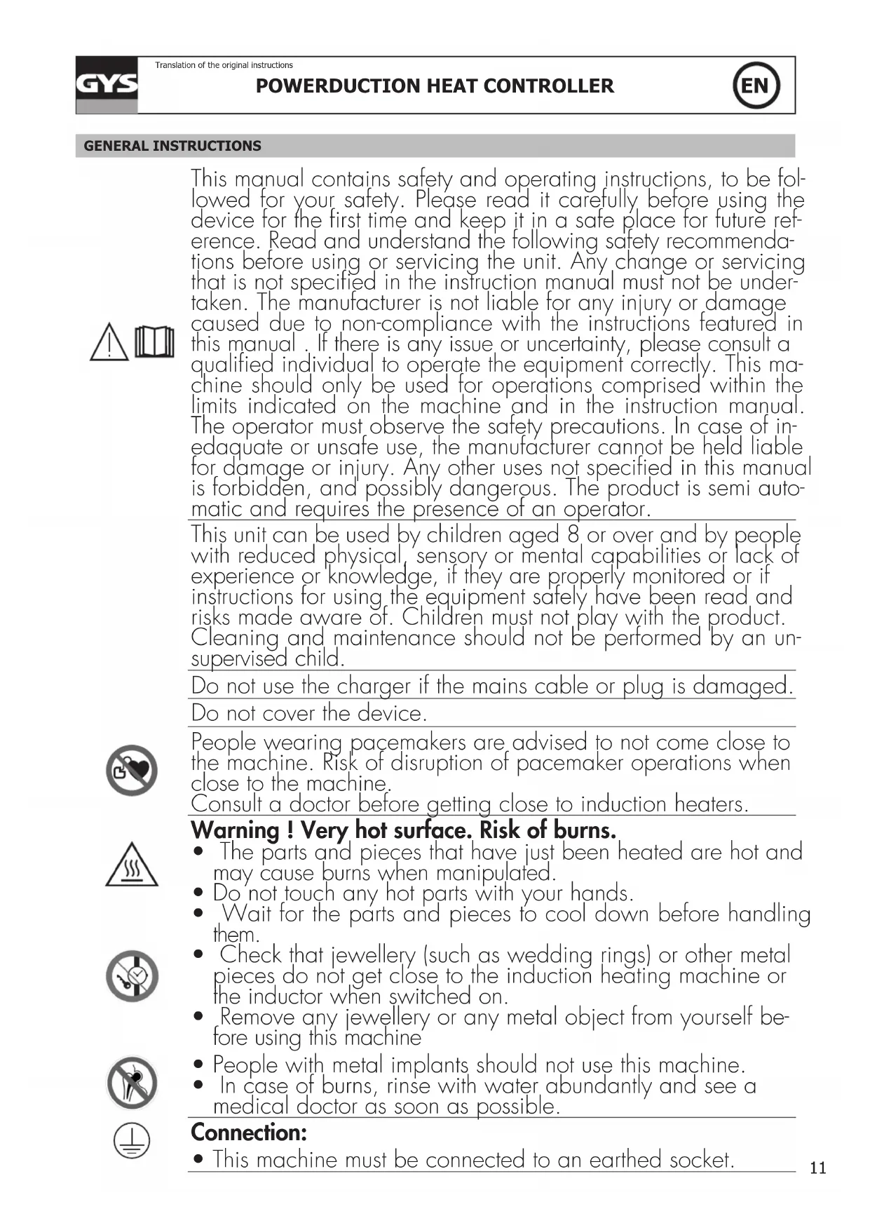 Translation of the original instructionsSAFETY AND DEVICE FAILURE - If the temperature input does not change after 5 s, the product is set to fault “E12”. - If a thermocouple breaks, then the regulation stops because the voltage U T° exceeds the maximum voltage of 4.9 V. - f the temperature drops signicantly within a short period of time (e.g. when thermocouple probes go out of order), the heating stops and the product goes to fault “E11”. - In order to have the most accurate control possible, the measuring point(s) must be as close as possible to the inductor. - This is the reason for the 2 thermocouples on the external interface. - The display shows the highest temperature measured by the sensors. WARRANTY The warranty covers faulty workmanship for 2 years from the date of purchase (parts and labour). The warranty does not cover: