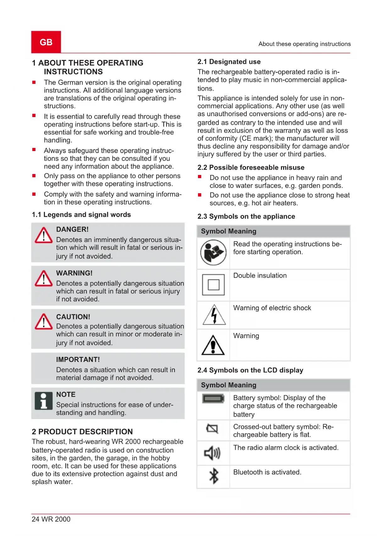 DANGER! Denotes an imminently dangerous situa- tion which will result in fatal or serious in- jury if not avoided. WARNING! Denotes a potentially dangerous situation which can result in fatal or serious injury if not avoided. CAUTION! Denotes a potentially dangerous situation which can result in minor or moderate in- jury if not avoided. IMPORTANT! Denotes a situation which can result in material damage if not avoided. NOTE Special instructions for ease of under- standing and handling. 2 PRODUCT DESCRIPTION The robust, hard-wearing WR2000 rechargeable battery-operated radio is used on construction sites, in the garden, the garage, in the hobby room, etc. It can be used for these applications due to its extensive protection against dust and splash water.