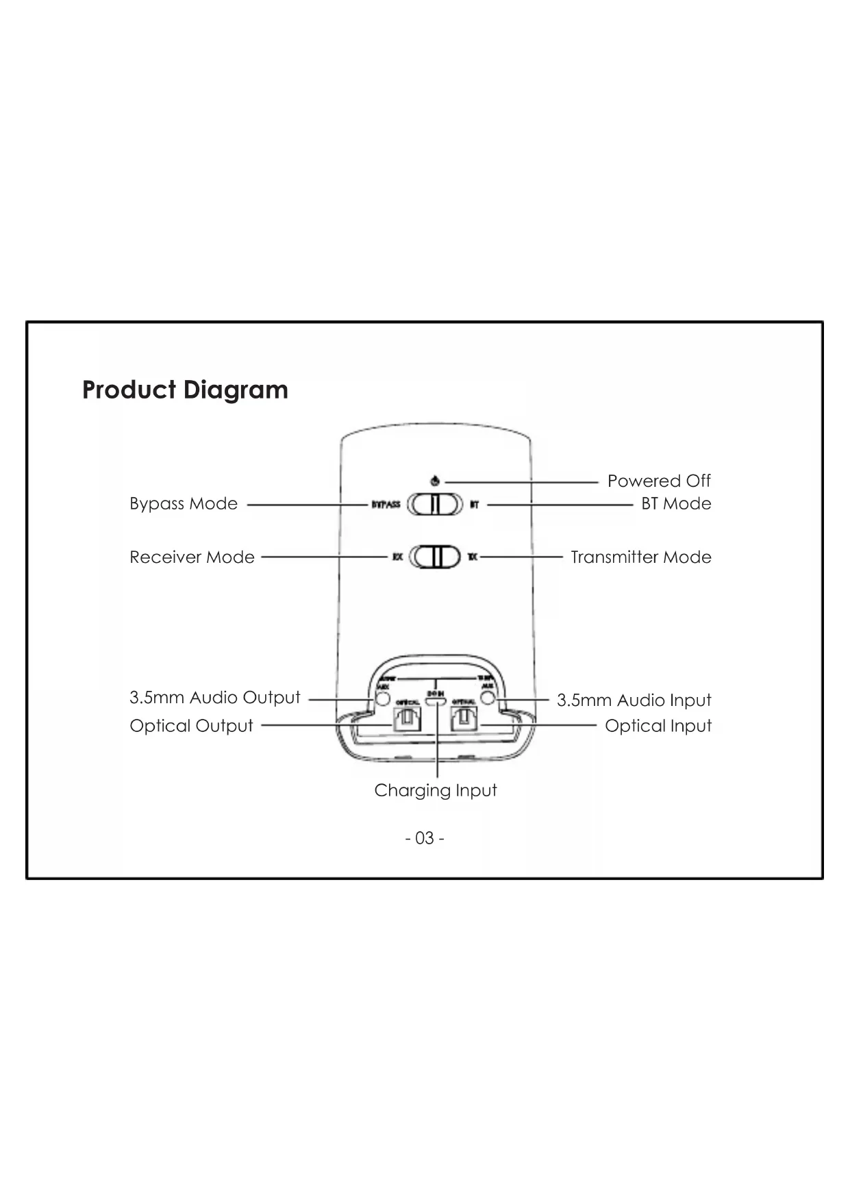 Specifications- 03 - Product Diagram Bypass Mode Receiver Mode 3.5mm Audio Output Optical Output Powered Off BT Mode Transmitter Mode 3.5mm Audio Input Optical Input Charging InputConnect one end of the included 3.5mm audio cable or Toslink optical cable to the 3.5mm audio output or optical output of BR-O8. Connect the other end to your wired audio equipment (wired headphones, speaker, or stereo system). You can also plug your audio equipment cable directly into BR-O8 instead Connect the BR-O8 to a power source with the micro-USB cable Slide the RX/TX switch to “RX” position and slide the Power/Mode switch to “BT” position Tap and hold for 3 seconds, and the BR-O8 will enter pairing mode with the square connection status indicator flashing white rapidly Activate the pairing function of your wireless-compatible audio device (like a smartphone) and select “AUKEY BR-O8” Once paired, there will be a solid white “A” indicator on the display If you want to pair with a second wireless-compatible audio device for dual device connection, repeat steps 4 & 5 with that device Once paired, there will be solid white “A” and “B” indicators on the display