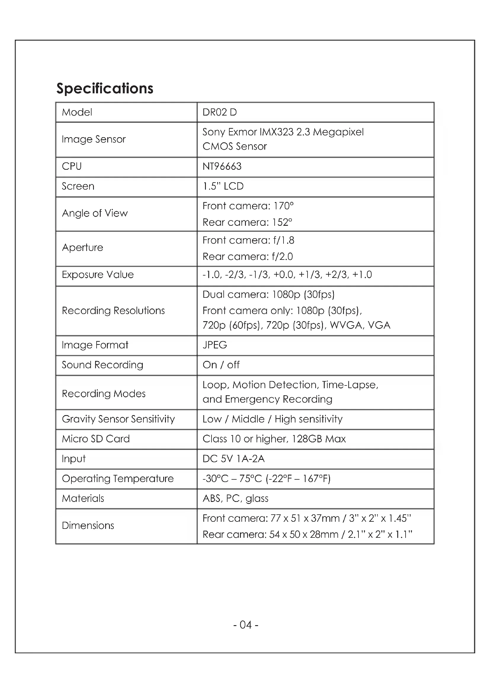 Thank you for purchasing the AUKEY DR02 D Dual Dash Cameras. Please read this user manual carefully and keep it for future reference. If you need any assistance, please contact our support team with your product model number and Amazon order number. Package Contents Dual Dash Cameras (front and rear camera) Dual-Port USB Car Charger 4m / 13ft USB Mini-B Cable 6m / 20ft USB Mini-B Cable Two Sticker Mounts Six 3M Stickers Six Cable Clips User Manual Warranty Card Optional Accessory: The AUKEY External GPS Antenna provides accurate position and speed data to the DR02 D that is saved and displayed on recorded videos. This extended information may support your case in any driving disputes or incidents. Note: Please use a Class 10 micro SD memory card (Max 128 GB) for reliable recording and performance. Format the micro SD card in the dash camera before first use. Visitwww.aukey.com/downloadstodownloadthelatestfirmware.- 02 - Product Diagram Front Camera USB Mini-B Power Input GPSInput USB Mini-B AV Input Mount Locking Clip Lens Microphone Outward LED Status Indicator Reset Button MicroSDCardSlot- 03 - Screen Control Buttons Inward LED Status Indicator Screen Indicator 1080P+1080P 00:01:14 2049/08/13 22:15:06 USB Mini-B AV Output Outward LED Status Indicator Lens Mount Locking Clip Rear Camera- 04 - Specifications Model Image Sensor CPU Screen Angle of View Aperture Exposure Value Recording Resolutions Image Format Sound Recording Recording Modes Gravity Sensor Sensitivity Micro SD Card Input Operating Temperature Materials Dimensions DR02 D Sony Exmor IMX323 2.3 Megapixel CMOS Sensor NT96663 1.5” LCD Front camera: 170° Rear camera: 152° Front camera: f/1.8 Rear camera: f/2.0 -1.0, -2/3, -1/3, +0.0, +1/3, +2/3, +1.0 Dual camera: 1080p (30fps) Front camera only: 1080p (30fps), 720p (60fps), 720p (30fps), WVGA, VGA JPEG On / off Loop, Motion Detection, Time-Lapse, and Emergency Recording Low / Middle / High sensitivity Class 10 or higher, 128GB Max DC 5V 1A-2A -30°C – 75°C (-22°F – 167°F) ABS, PC, glass Front camera: 77 x 51 x 37mm / 3” x 2” x 1.45” Rear camera: 54 x 50 x 28mm / 2.1” x 2” x 1.1”- 05 - System LED Indicators There are four indicators in total. Each camera unit has an LED indicator that faces outside (to let others know you have cameras active). The front camera has an LED indicator which faces inside and an on-screen indicator (both for your reference). The outward LED indicators on both cameras can be switched off if you want the dash camera system to be even less visible to people outside. Go to Setup > Detect Led > select Off > press OK. Outward LED Status Indicators Solid Green Flashing Green Inward LED Status Indicator Solid Green Flashing Green Screen Indicator Off Flashing Red Meaning On; not recording On; recording Note: In Motion Detection mode, only the inward LED indicator will be on in standby. Once motion is detected, all indicators will operate the same as normal recording. Button Recording Mode Enter Emergency Recording mode View playlist (short press) Turn on/off Audio Recording (long press) Open Setup menu (short press) Take a snapshot (long press) Playlist & Setup Menu Return to previous menu Move up Move down Playback Mode Return to playlist / Stop Delete / Rewind Lock & Unlock / Fast-forward Control Buttons- 06 - Toggle screen view and turn off the screen Enter / Confirm Play / Pause Reset Button Short press to restart the device (this won’t affect saved files) There are 3 screen view options– Dual view, front camera, and rear camera. When dash camera is powered on, press the OK button to switch views or switch off the screen (recording continues). ‘Screen Saver’ setting can also be used to automatically switch off the screen after 1 or 3 minutes. Using a Micro SD Card The camera doesn’t include internal storage and requires a micro SD card (Class 10+ recommended and 128GB Max supported) to function. A 128GB micro SD card should store around 20 hours of 1080p recordings. Use a high-quality, branded card for maximum reliability. Insert a micro SD card into the front camera micro SD card slot. Later, when the camera is powered on, format it (‘Format’ option in Dash Camera ‘Setup’) to prepare the card for first use in the dash camera. Formatting will permanently erase any data on the micro SD card. For best performance, format periodically (after backing up any important files). ‘Format Warning’ in ‘Settings’ can be switched on to remind you to do this. Installation & Powering On/Off The diagram below shows the parts and exact way the cables must be connected. You may wish to connect and test the dash camera system before proper, long-term installation in your vehicle. For convenient testing in your home, a power bank or wall charger with 1A or 2A USB port can be used instead of the car charger.- 07 - 4m / 13ft USB Mini-B Cable 6m / 20ft USB Mini-B Cable Dual-Port USB Car Charger Front Camera Rear Camera 1080P+1080P 00:01:14 2049/08/13 22:15:06- 08 -