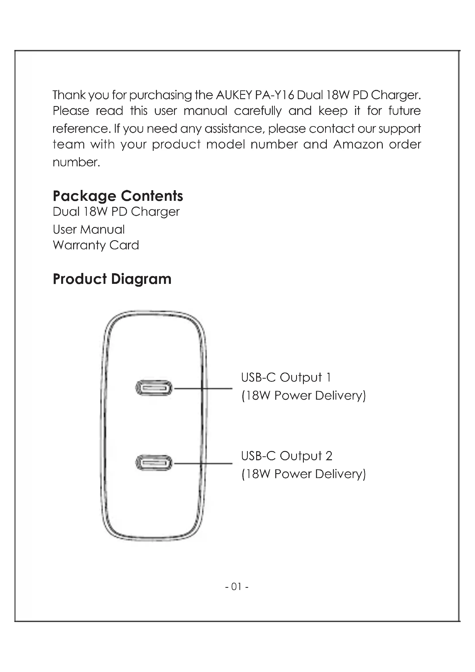 01~03 04~06 07~09 10~12 13~15 16~18- 01 - Thank you for purchasing the AUKEY PA-Y16 Dual 18W PD Charger. Please read this user manual carefully and keep it for future reference. If you need any assistance, please contact our support team with your product model number and Amazon order number. Package Contents Dual 18W PD Charger User Manual Warranty Card Product Diagram USB-C Output 1 (18W Power Delivery) USB-C Output 2 (18W Power Delivery)- 02 - Specifications Model Technology Input PA-Y16 Power Delivery 3.0 AC 100–240V 64 x 63 x 29mm / 2.52” x 2.48” x 1.14” 106g / 3.74oz Note: This charger does support up to 18W output from both ports simultaneously (36W total) What is Power Delivery? USB Power Delivery is a new, universal multi-voltage charging standard that dynamically negotiates power output over a USB Type-C connection to safely and efficiently recharge a wide range of compatible devices. To get USB PD, the following are required: Device (phone, tablet, laptop) that supports USB PD USB-C Charger with USB PD USB-C to C cable Output 1/2 Maximum Power Output Dimensions Weight