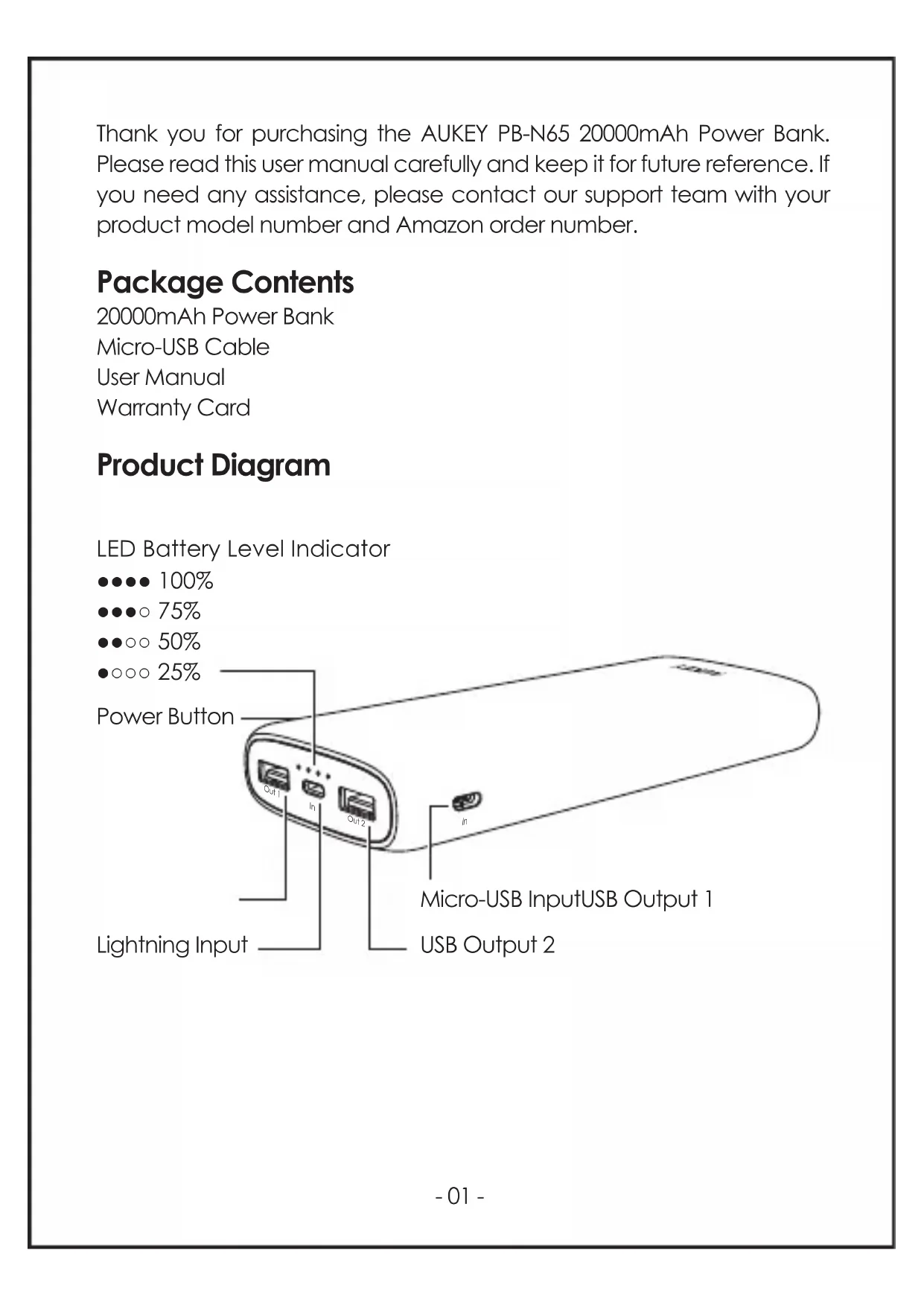 01~03 04~06 07~09 10~12 13~15 16~18 Contents 材质: 105g铜版纸尺寸: 80x110mm 印刷: 单黑双面印刷 装订方式: 骑马钉装订 封面背面留白Thank you for purchasing the AUKEY PB-N65 20000mAh Power Bank. Please read this user manual carefully and keep it for future reference. If you need any assistance, please contact our support team with your product model number and Amazon order number. Package Contents 20000mAh Power Bank Micro-USB Cable User Manual Warranty Card Product Diagram