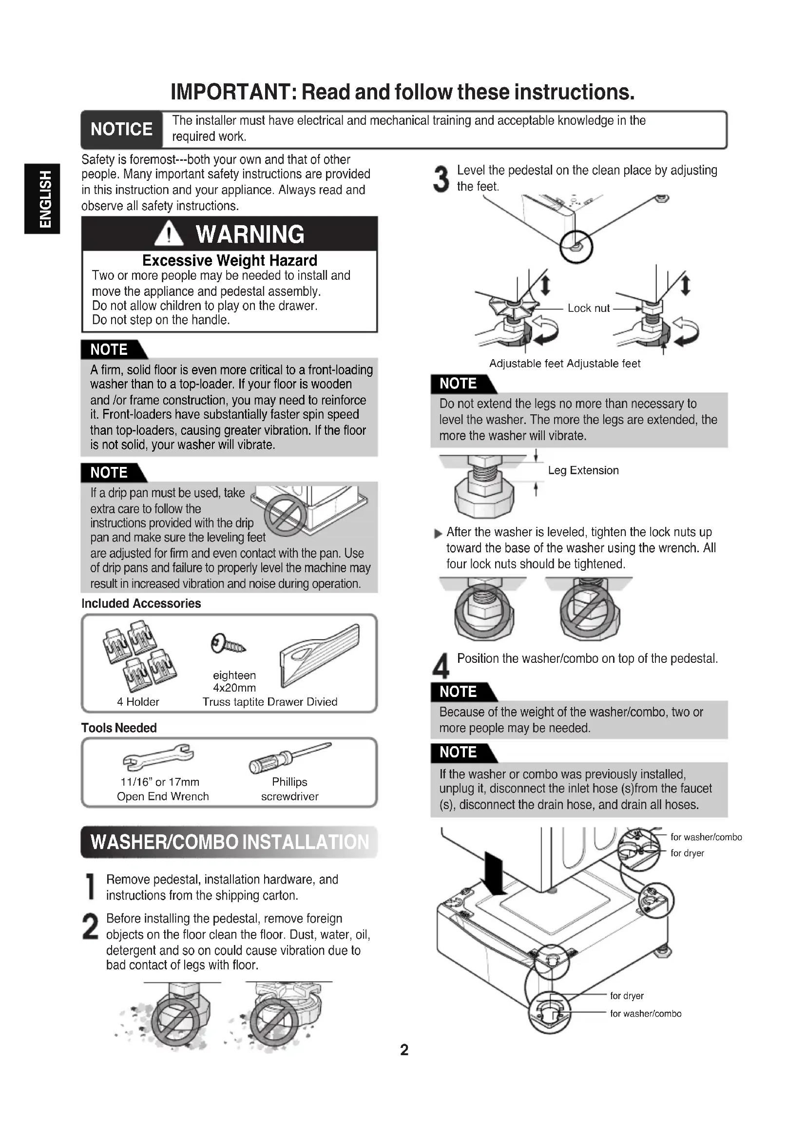 Before installing the pedestal, remove foreignobjects on the floor clean the floor. Dust, water, oil,detergent and so on could cause vibration due tobad contact of legs with floor. NOTE If a drip pan must be used, takeextra care to follow theinstructions provided with the drippan and make sure the leveling feetare adjusted for firm and even contact with the pan. Useof drip pans and failure to properly level the machine mayresult in increased vibration and noise during operation.Included Accessories NOTE 4 Holdereighteen4x20mmTruss taptite Drawer DiviedTools Needed11/16” or 17mmOpen End WrenchPhillipsscrewdriver3 ENGLISH Make sure the holes on the pedestal align with the holes in the appliance, then install 4 screws at each corner to securely attach the appliance to the pedestal. Level the washer/combo on the pedestal by adjusting the feet. Lock nut Adjustable feet Adjustable feet Move the washer/combo to the desired place. Diagonal Check When pushing down the edges of the washing machine top plate diagonally, the machine should not move up and down at all.(Please check both directions.) If the machine rocks when pushing the machine top plate diagonally, adjust the feet again. NOTE To make sure that the washer is properly level, run the washer with a test load: place approximately 6 Pound/2.7Kg of laundry in the machine. Then press POWER, press RINSE+SPIN, and then press the START/PAUSE button. See the following sections for additional information on cycle selection and operation. Verify that the washer does not rock or vibrate excessively during the spin cycle. If the washer vibrates or shakes, adjust the leveling feet until the washer is stable and retest. NOTE If the screws are not installed properly, noise and vibration may result. For WASHER: 16 SCREWS For DRYER: 8 SCREWS NOTE The appliance and pedestal assembly must be placed on a solid and level floor for proper operation. Adjust the legs of the appliance and pedestal by turning with a wrench. Then, adjust the lock nut toward the pedestal while holding the pedestal leg using a wrench. NOTE Lock nut Adjustable feet Adjustable feet4 ENGLISH Because of the weight of the dryer, two or more people may be needed. NOTE Remove pedestal, installation hardware, and instructions from the shipping carton. Make sure the holes on the pedestal align with the holes in the appliance, then install 2 screws at each corner to securely attach the appliance to the pedestal. DRYER INSTALLATION Position dryer on top of the pedestal. Insert the T-clip of the 4 retainers into the dryer base as shown. Press up on the back of the clip and pull outward to lock into place. for washer/ combo for dryer for dryer for washer/ combo If dryer was previously installed, uninstall it as follows: NOTE A. Uninstalling an electric dryer: