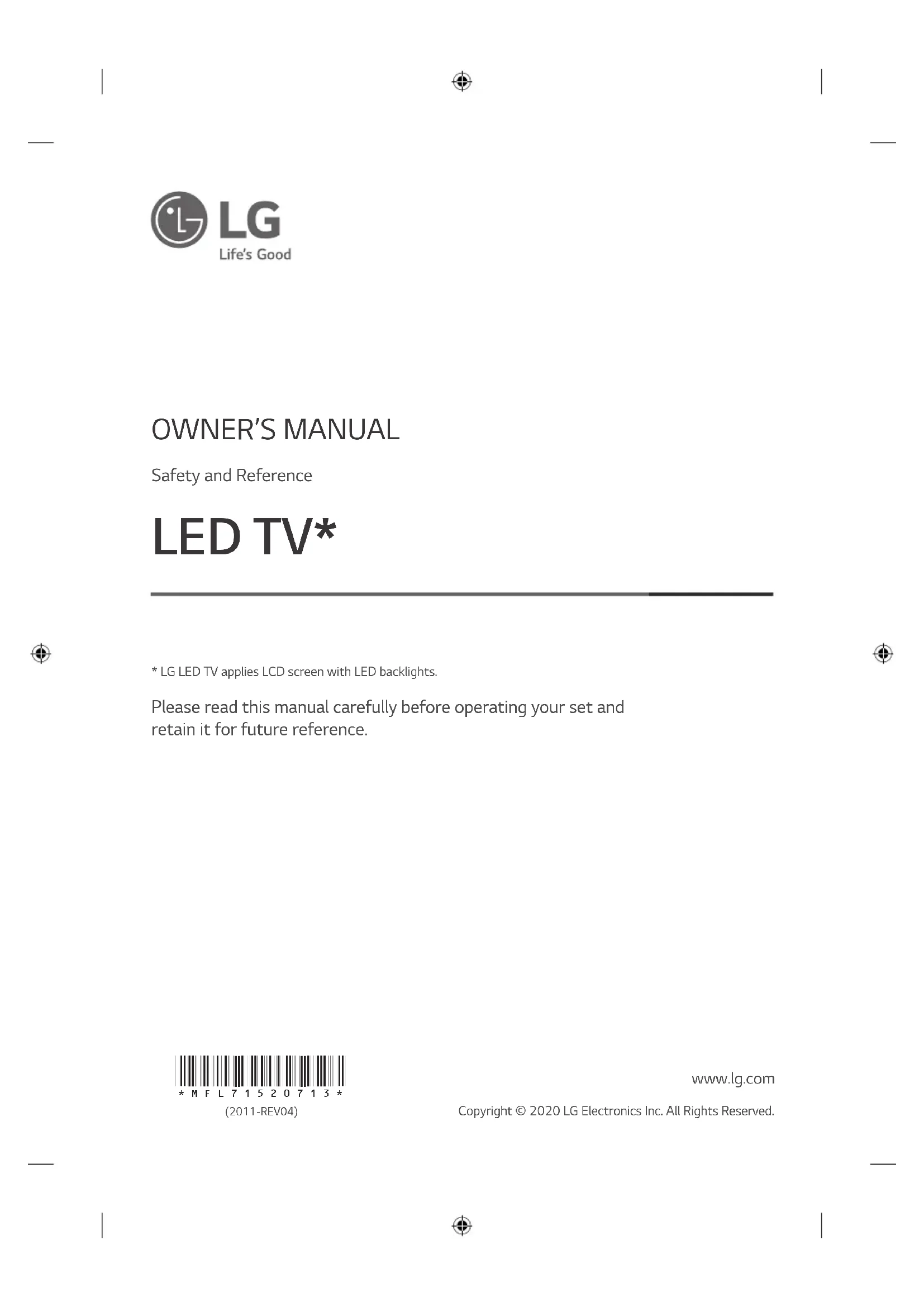 - LG LED TV applies LCD screen with LED backlights. www.lg.com Copyright © 2020 LG Electronics Inc. All Rights Reserved. *MFL71520713* (2011-REV04)2 ENGLISH_index Warning! Safety instructions CAUTION