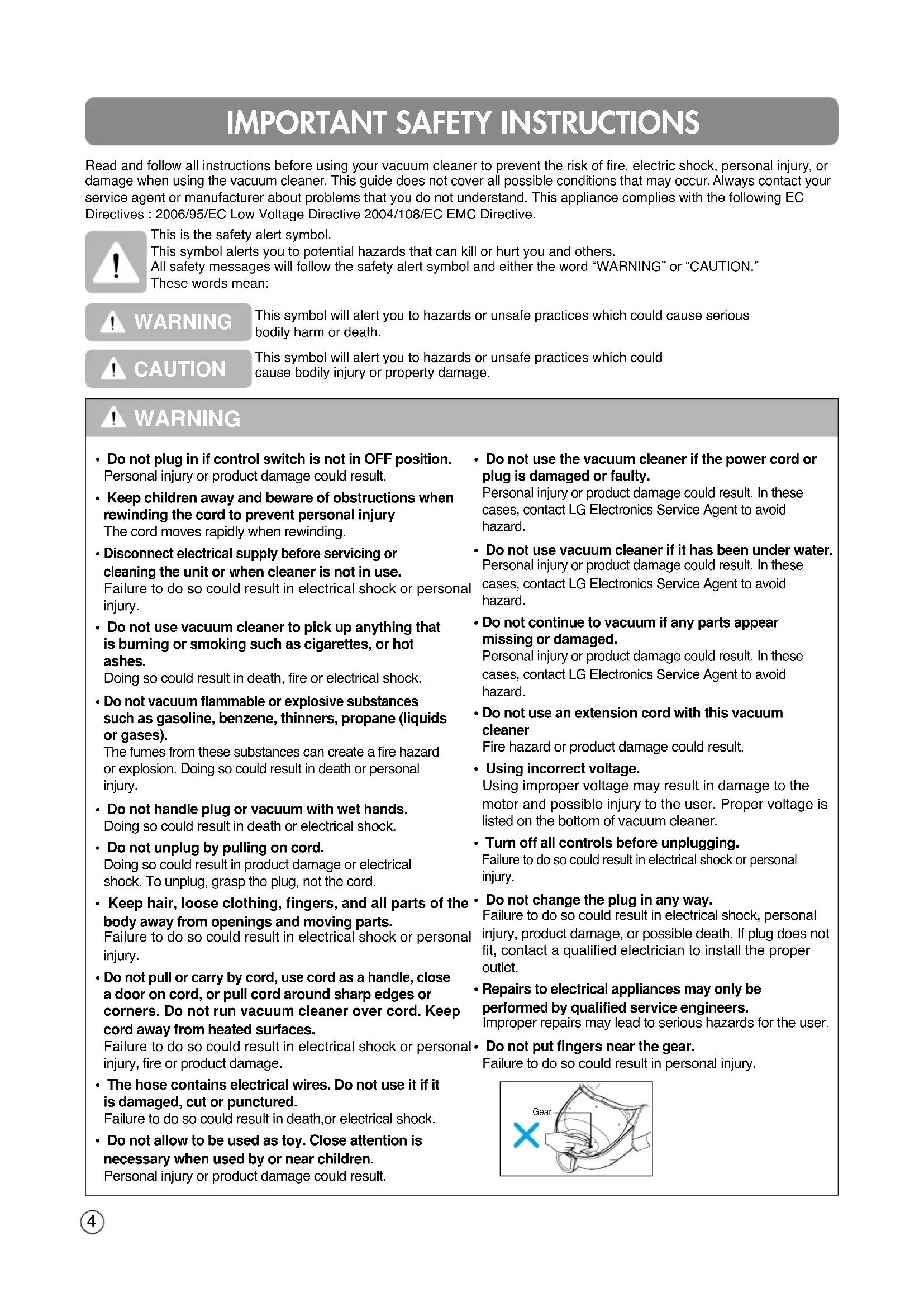 Read and follow all instructions before using your vacuum cleaner to prevent the risk of fire, electric shock, personal injury, or damage when using the vacuum cleaner. This guide does not cover all possible conditions that may occur. Always contact your service agent or manufacturer about problems that you do not understand. This appliance complies with the following ECDirectives : 2006/95/EC Low Voltage Directive 2004/108/EC EMC Directive.This is the safety alert symbol.This symbol alerts you to potential hazards that can kill or hurt you and others.All safety messages will follow the safety alert symbol and either the word “WARNING” or “CAUTION.”These words mean:This symbol will alert you to hazards or unsafe practices which could cause seriousbodily harm or death.This symbol will alert you to hazards or unsafe practices which couldcause bodily injury or property damage.