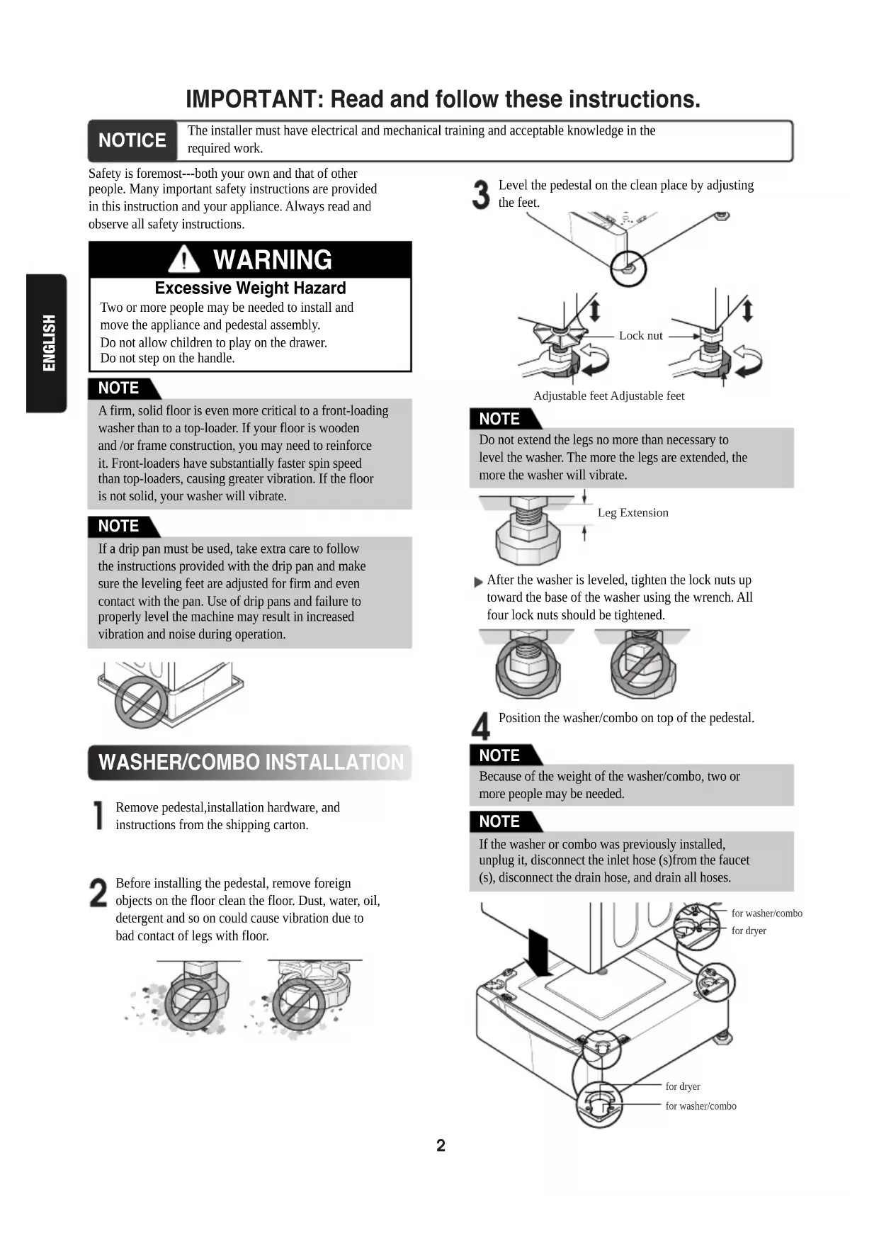 Before installing the pedestal, remove foreignobjects on the floor clean the floor. Dust, water, oil,detergent and so on could cause vibration due tobad contact of legs with floor.After the washer is leveled, tighten the lock nuts uptoward the base of the washer using the wrench. Allfour lock nuts should be tightened.Level the pedestal on the clean place by adjustingthe feet. NOTE If a drip pan must be used, take extra care to followthe instructions provided with the drip pan and makesure the leveling feet are adjusted for firm and evencontact with the pan. Use of drip pans and failure toproperly level the machine may result in increasedvibration and noise during operation. NOTE Do not extend the legs no more than necessary tolevel the washer. The more the legs are extended, themore the washer will vibrate. NOTE Because of the weight of the washer/combo, two ormore people may be needed. NOTE If the washer or combo was previously installed,unplug it, disconnect the inlet hose (s)from the faucet(s), disconnect the drain hose, and drain all hoses. NOTE3 ENGLISH Make sure the holes on the pedestal align with the holes in the appliance, then install 4 screws at each corner to securely attach the appliance to the pedestal. Level the washer/combo on the pedestal by adjusting the feet. Lock nut Adjustable feet Adjustable feet Move the washer/combo to the desired place. Diagonal Check When pushing down the edges of the washing machine top plate diagonally, the machine should not move up and down at all.(Please check both directions.) If the machine rocks when pushing the machine top plate diagonally, adjust the feet again. NOTE To make sure that the washer is properly level, run the washer with a test load: place approximately 6 pounds of laundry in the machine. Then press POWER, press RINSE+SPIN, and then press the START/PAUSE button. See the following sections for additional information on cycle selection and operation. Verify that the washer does not rock or vibrate excessively during the spin cycle. If the washer vibrates or shakes, adjust the leveling feet until the washer is stable and retest. NOTE If the screws are not installed properly, noise and vibration may result. NOTE The appliance and pedestal assembly must be placed on a solid and level floor for proper operation. Adjust the legs of the appliance and pedestal by turning with a wrench. Then, adjust the lock nut toward the pedestal while holding the pedestal leg using a wrench. NOTE Lock nut Adjustable feet Adjustable feet4 ENGLISH Because of the weight of the dryer, two or more people may be needed. NOTE Remove pedestal,installation hardware, and instructions from the shipping carton. Make sure the holes on the pedestal align with the holes in the appliance, then install 2 screws at each corner to securely attach the appliance to the pedestal. DRYER INSTALLATION Position dryer on top of the pedestal. Insert the T-clip of the 4 retainers into the dryer base as shown. Press up on the back of the clip and pull outward to lock into place. for washer/ combo for dryer for dryer for washer/ combo If dryer was previously installed, uninstall it as follows: NOTE A. Uninstalling an electric dryer: