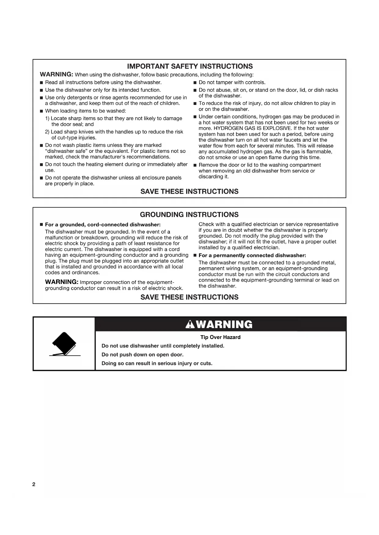 Under certain conditions, hydrogen gas may be produced in a hot water system that has not been used for two weeks or more. HYDROGEN GAS IS EXPLOSIVE. If the hot water system has not been used for such a period, before using the dishwasher turn on all hot water faucets and let the water flow from each for several minutes. This will release any accumulated hydrogen gas. As the gas is flammable, do not smoke or use an open flame during this time. ■ Remove the door or lid to the washing compartment when removing an old dishwasher from service or discarding it. GROUNDING INSTRUCTIONS