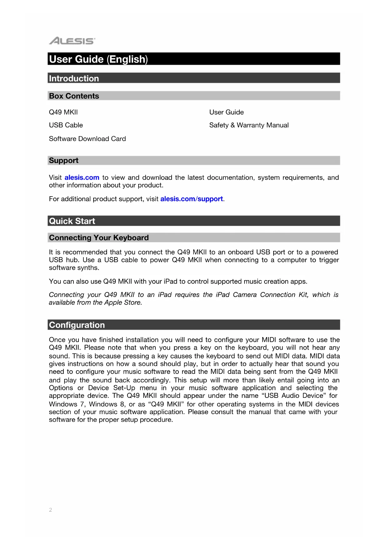 Appendix English ( 62 – 63 )2 User Guide (English) Introduction Box Contents Q49 MKII USB Cable Software Download Card User Guide Safety & Warranty Manual Support Visit alesis.com to view and download the latest documentation, system requirements, and other information about your product. For additional product support, visit alesis.com/support. Quick Start Connecting Your Keyboard It is recommended that you connect the Q49 MKII to an onboard USB port or to a powered USB hub. Use a USB cable to power Q49 MKII when connecting to a computer to trigger software synths. You can also use Q49 MKII with your iPad to control supported music creation apps. Connecting your Q49 MKII to an iPad requires the iPad Camera Connection Kit, which is available from the Apple Store. Configuration Once you have finished installation you will need to configure your MIDI software to use the Q49 MKII. Please note that when you press a key on the keyboard, you will not hear any sound. This is because pressing a key causes the keyboard to send out MIDI data. MIDI data gives instructions on how a sound should play, but in order to actually hear that sound you need to configure your music software to read the MIDI data being sent from the Q49 MKII and play the sound back accordingly. This setup will more than likely entail going into an Options or Device Set-Up menu in your music software application and selecting the appropriate device. The Q49 MKII should appear under the name “USB Audio Device” for Windows 7, Windows 8, or as “Q49 MKII” for other operating systems in the MIDI devices section of your music software application. Please consult the manual that came with your software for the proper setup procedure.3 Setup Items not listed under Introduction > Box Contents are sold separately.