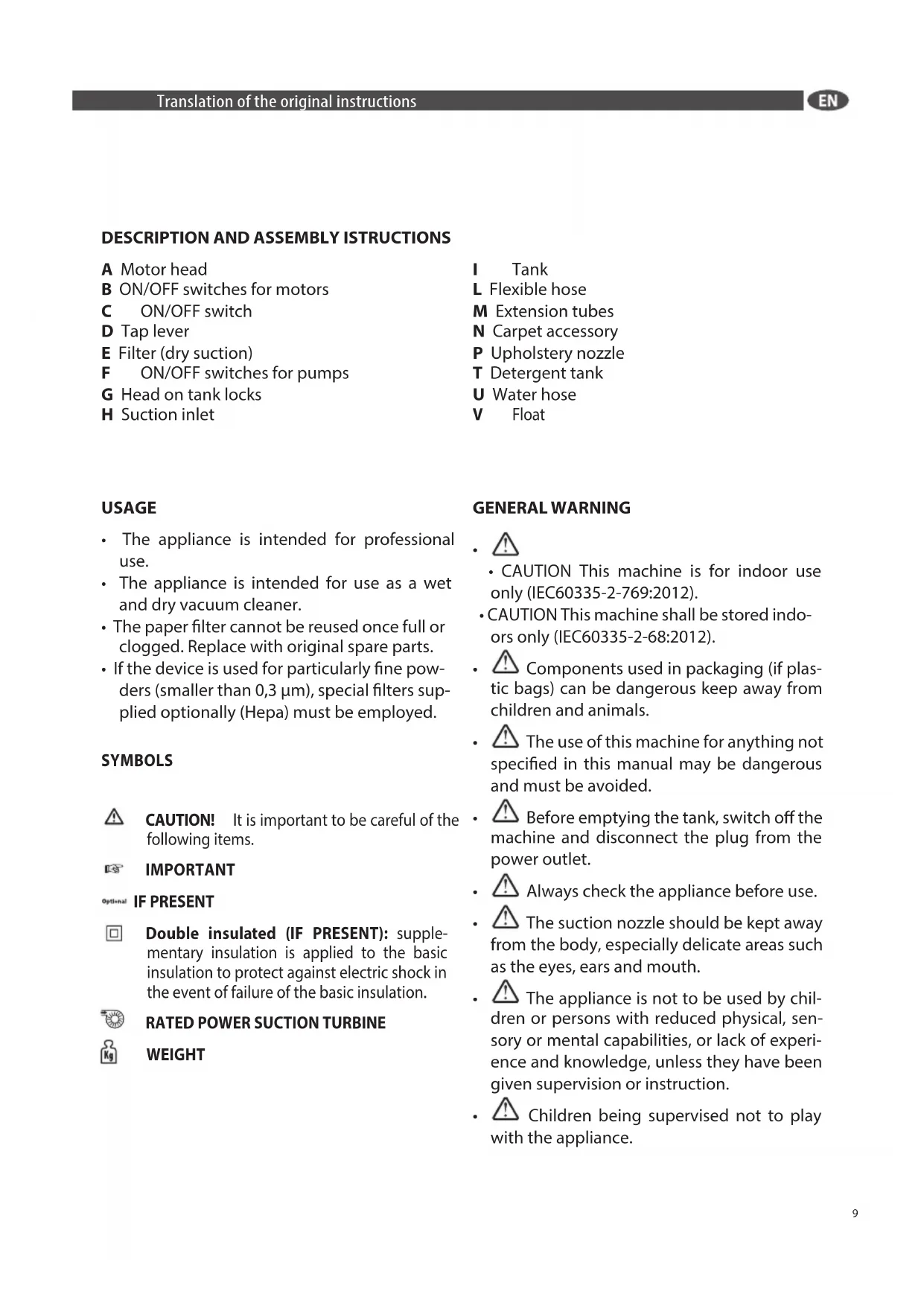 A Motor head B ON/OFF switches for motors C ON/OFF switch D Tap lever E Filter (dry suction) F ON/OFF switches for pumps G Head on tank locks H Suction inlet I Tank L Flexible hose M Extension tubes N Carpet accessory P Upholstery nozzle T Detergent tank U Water hose V Float USAGE