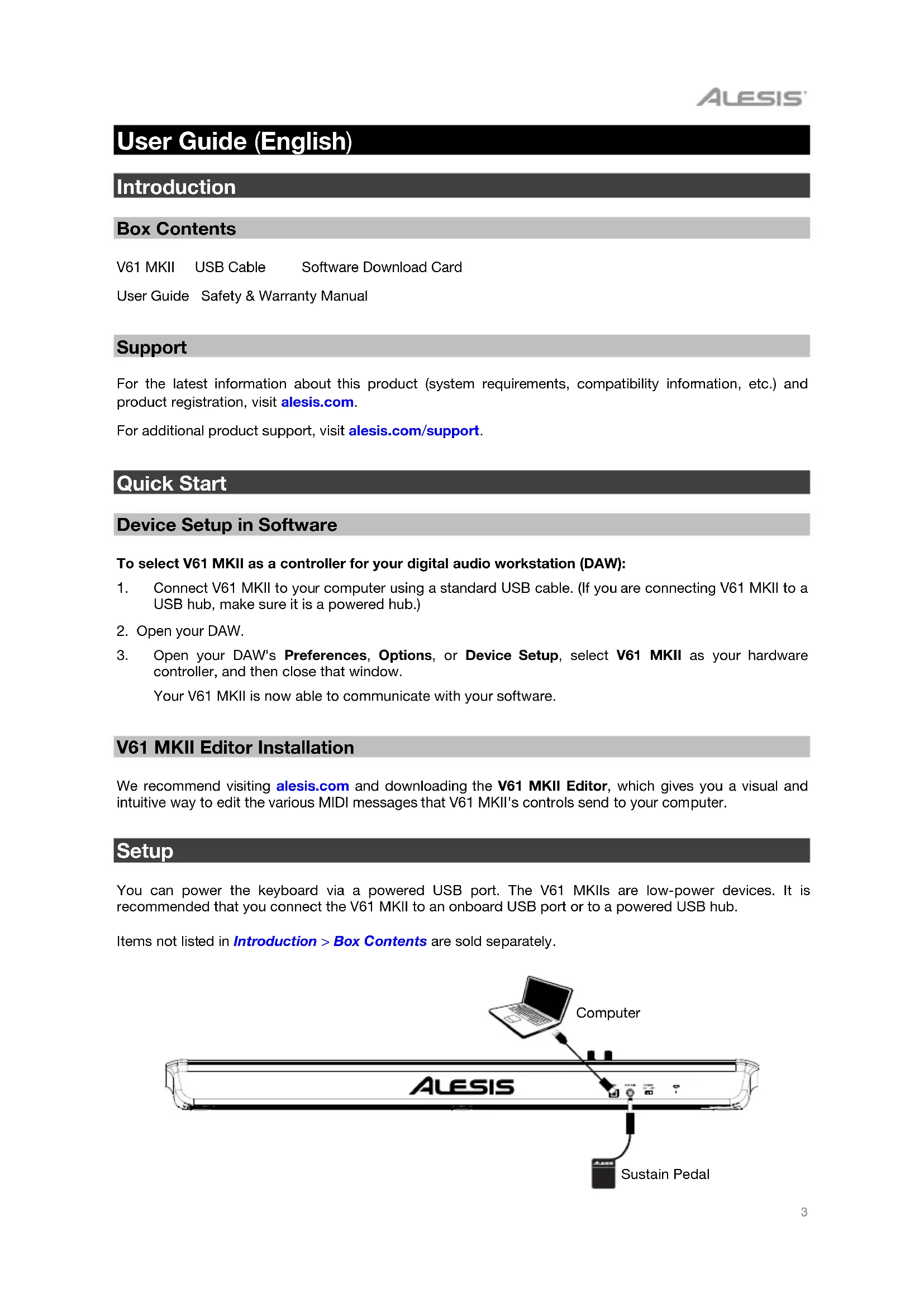 Appendix English ( 23 )23 User Guide (English) Introduction Box Contents V61 MKII USB Cable Software Download Card User Guide Safety & Warranty Manual Support For the latest information about this product (system requirements, compatibility information, etc.) and product registration, visit alesis.com. For additional product support, visit alesis.com/support. Quick Start Device Setup in Software To select V61 MKII as a controller for your digital audio workstation (DAW):