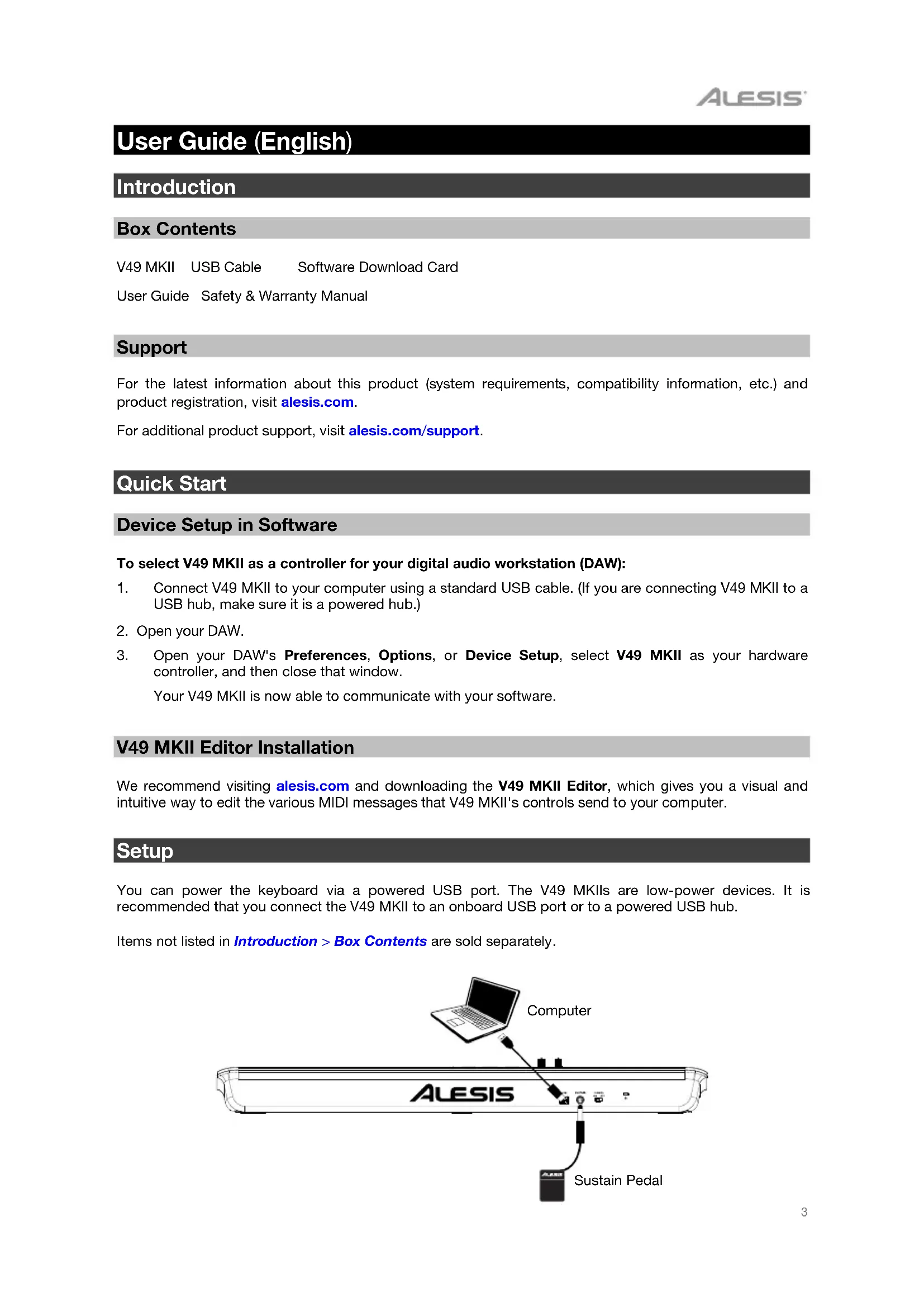 controller, and then close that window. Your V49 MKII is now able to communicate with your software. V49 MKII Editor Installation We recommend visiting alesis.com and downloading the V49 MKII Editor, which gives you a visual and intuitive way to edit the various MIDI messages that V49 MKII's controls send to your computer. Setup You can power the keyboard via a powered USB port. The V49 MKIIs are low-power devices. It is recommended that you connect the V49 MKII to an onboard USB port or to a powered USB hub. Items not listed in Introduction > Box Contents are sold separately.
