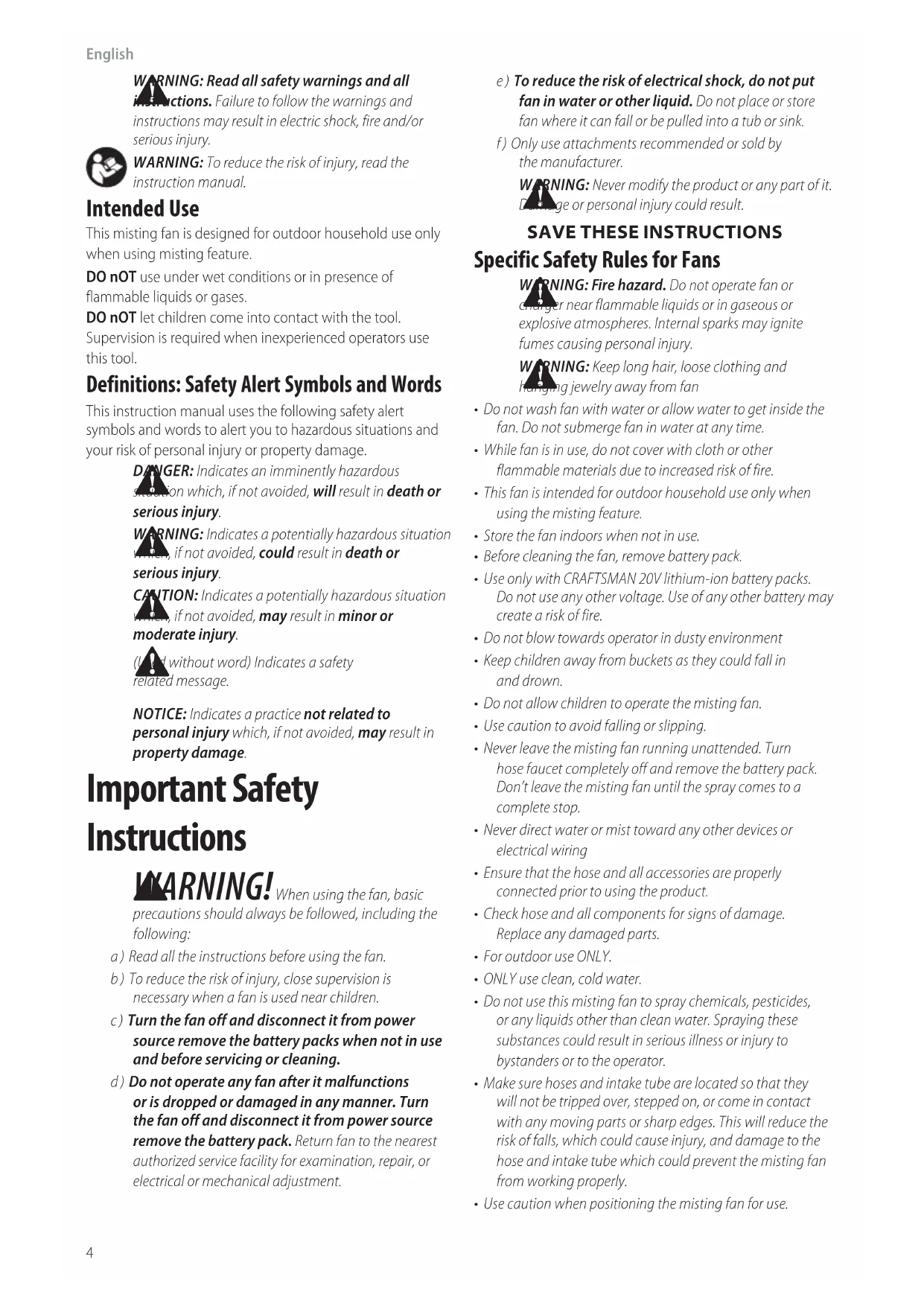 charger near flammable liquids or in gaseous or explosive atmospheres. Internal sparks may ignite fumes causing personalinjury. WARNING: Keep long hair, loose clothing and hanging jewelry away from fan• Do not wash fan with water or allow water to get inside the fan. Do not submerge fan in water at anytime.• While fan is in use, do not cover with cloth or other flammable materials due to increased risk offire.• This fan is intended for outdoor household use only when using the misting feature.• Store the fan indoors when not inuse.• Before cleaning the fan, remove batterypack.• Use only with CRAFTSMAN 20V lithium‑ion battery packs. Do not use any othervoltage. Use of any other battery may create a risk offire.• Do not blow towards operator in dusty environment• Keep children away from buckets as they could fall in anddrown.• Do not allow children to operate the mistingfan.• Use caution to avoid falling orslipping.• Never leave the misting fan running unattended. Turn hose faucet completely off and remove the battery pack. Don’t leave the misting fan until the spray comes to a completestop.• Never direct water or mist toward any other devices or electrical wiring• Ensure that the hose and all accessories are properly connected prior to using theproduct.• Check hose and all components for signs of damage. Replace any damagedparts.• For outdoor useONLY.• ONLY use clean, coldwater.• Do not use this misting fan to spray chemicals, pesticides, or any liquids other than clean water. Spraying these substances could result in serious illness or injury to bystanders or to theoperator.• Make sure hoses and intake tube are located so that they will not be tripped over, stepped on, or come in contact with any moving parts or sharp edges. This will reduce the risk of falls, which could cause injury, and damage to the hose and intake tube which could prevent the misting fan from workingproperly.• Use caution when positioning the misting fan foruse.e ) To reduce the risk of electrical shock, do not put fan in water or other liquid. Do not place or store fan where it can fall or be pulled into a tub orsink.f ) Only use attachments recommended or sold by themanufacturer.