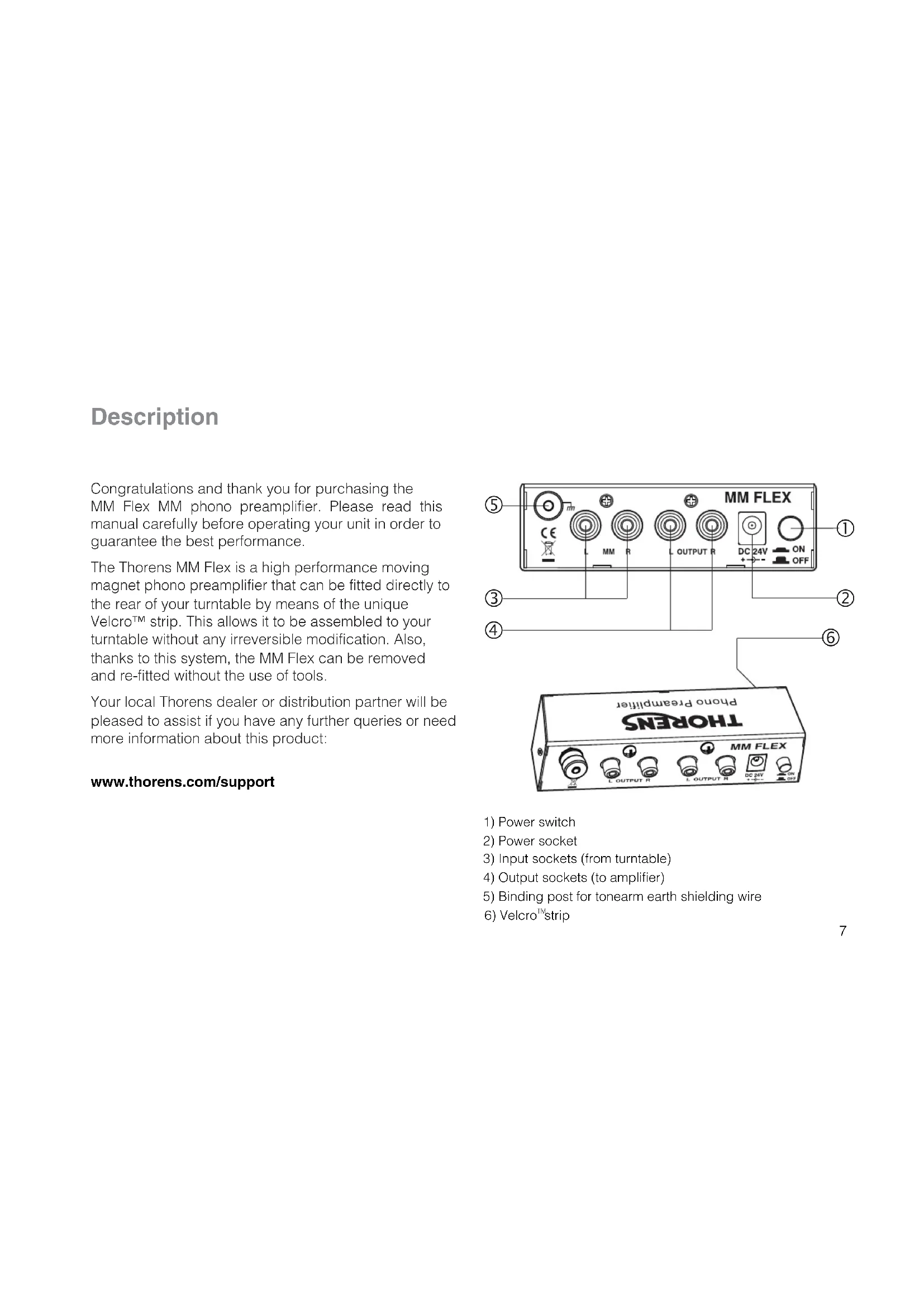 Congratulations and thank you for purchasing the MM Flex MM phono preamplifier. Please read this manual carefully before operating your unit in order to guarantee the best performance. Your local Thorens dealer or distribution partner will be pleased to assist if you have any further queries or need more information about this product: The Thorens MM Flex is a high performance moving magnet phono preamplifier that can be fitted directly to the rear of your turntable by means of the unique Velcro™ strip. This allows it to be assembled to your turntable without any irreversible modification. Also, thanks to this system, the MM Flex can be removed and re-fitted without the use of tools.