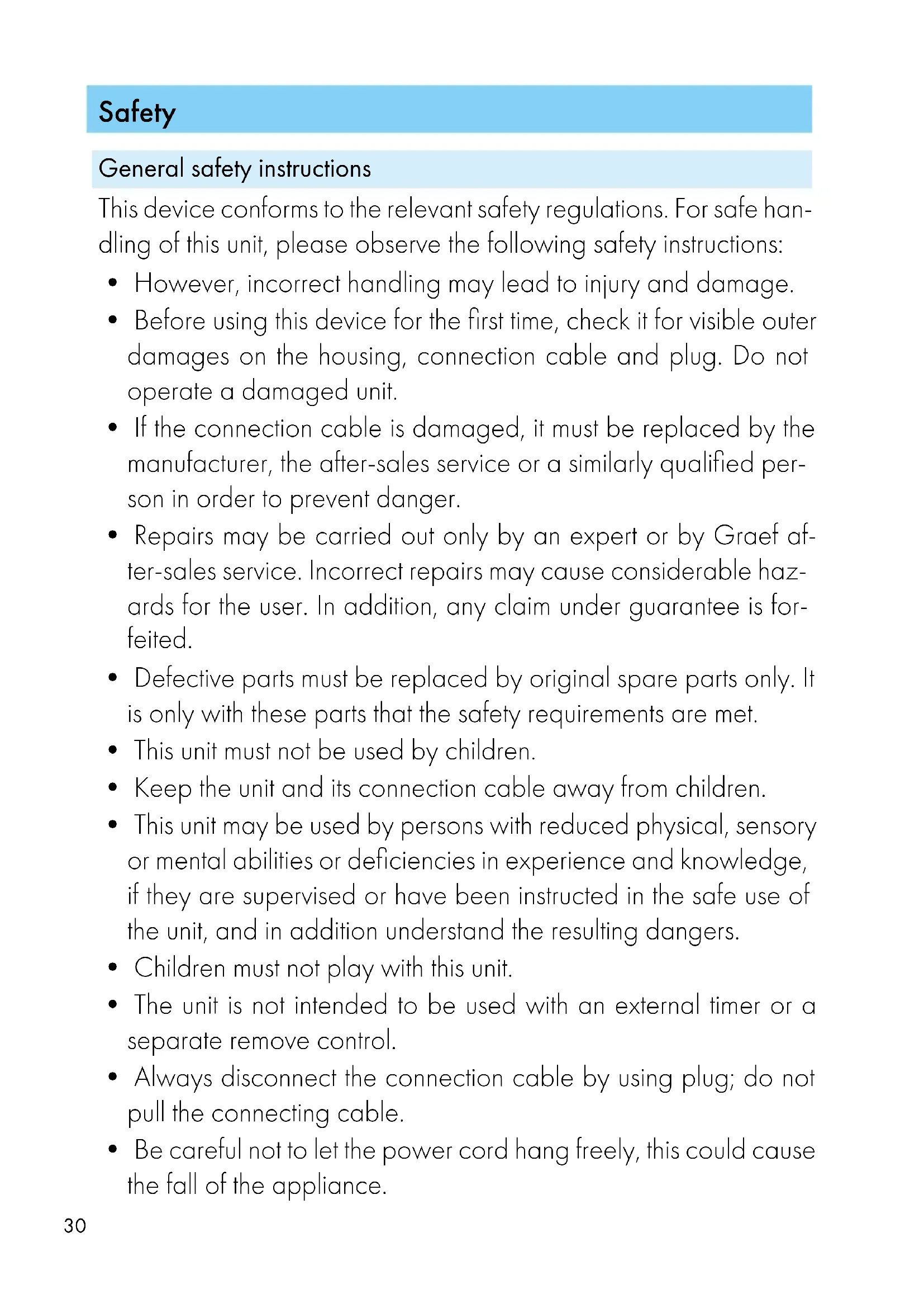 - Repairs may be carried out only by an expert or by Graef af- ter-sales service. Incorrect repairs may cause considerable haz- ards for the user. In addition, any claim under guarantee is for- feited.