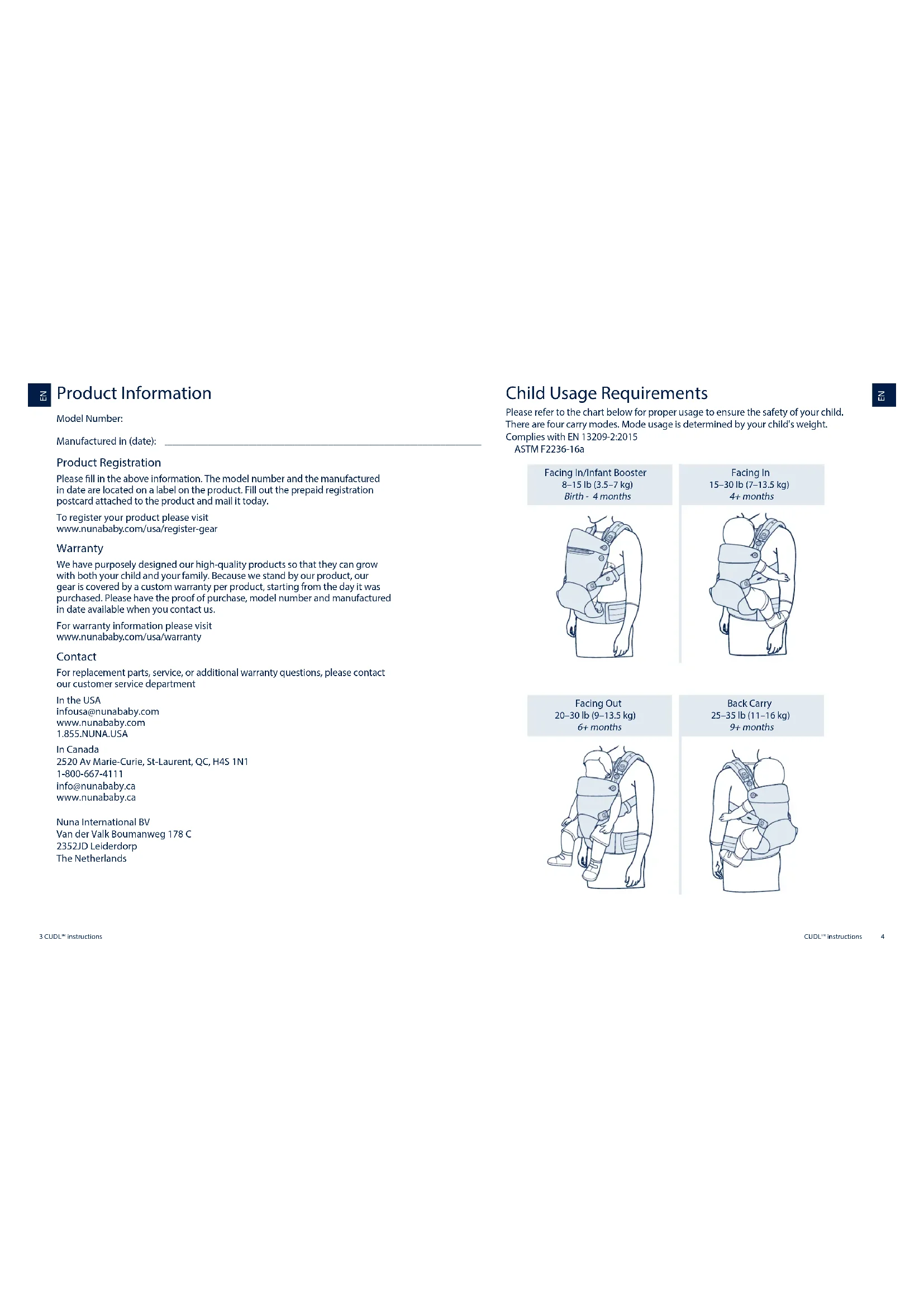 In Canada 2520 Av Marie-Curie, St-Laurent, QC, H4S 1N1 1-800-667-4111 info@nunababy.ca www.nunababy.ca Nuna International BV Van der Valk Boumanweg 178 C 2352JD Leiderdorp The Netherlands Child Usage Requirements Please refer to the chart below for proper usage to ensure the safety of your child. There are four carry modes. Mode usage is determined by your child's weight. Complies with EN 13209-2:2015 ASTM F2236-16a Facing Out 20–30 lb (9–13.5 kg) 6+ months Back Carry 25–35 lb (11–16 kg) 9+ months Facing In/Infant Booster 8–15 lb (3.5–7 kg) Birth - 4 months Facing In 15–30 lb (7–13.5 kg) 4+ months 3 CUDL™ instructions 4CUDL™ instructionsEN