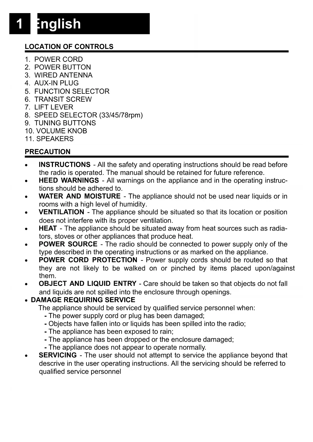 PRECAUTION INSTRUCTIONS - All the safety and operating instructions should be read before the radio is operated. The manual should be retained for future reference. HEED WARNINGS - All warnings on the appliance and in the operating instruc- tions should be adhered to. WATER AND MOISTURE - The appliance should not be used near liquids or in rooms with a high level of humidity. VENTILATION - The appliance should be situated so that its location or position does not interfere with its proper ventilation. HEAT - The appliance should be situated away from heat sources such as radia- tors, stoves or other appliances that produce heat. POWER SOURCE - The radio should be connected to power supply only of the type described in the operating instructions or as marked on the appliance. POWER CORD PROTECTION - Power supply cords should be routed so that they are not likely to be walked on or pinched by items placed upon/against them. OBJECT AND LIQUID ENTRY - Care should be taken so that objects do not fall and liquids are not spilled into the enclosure through openings.