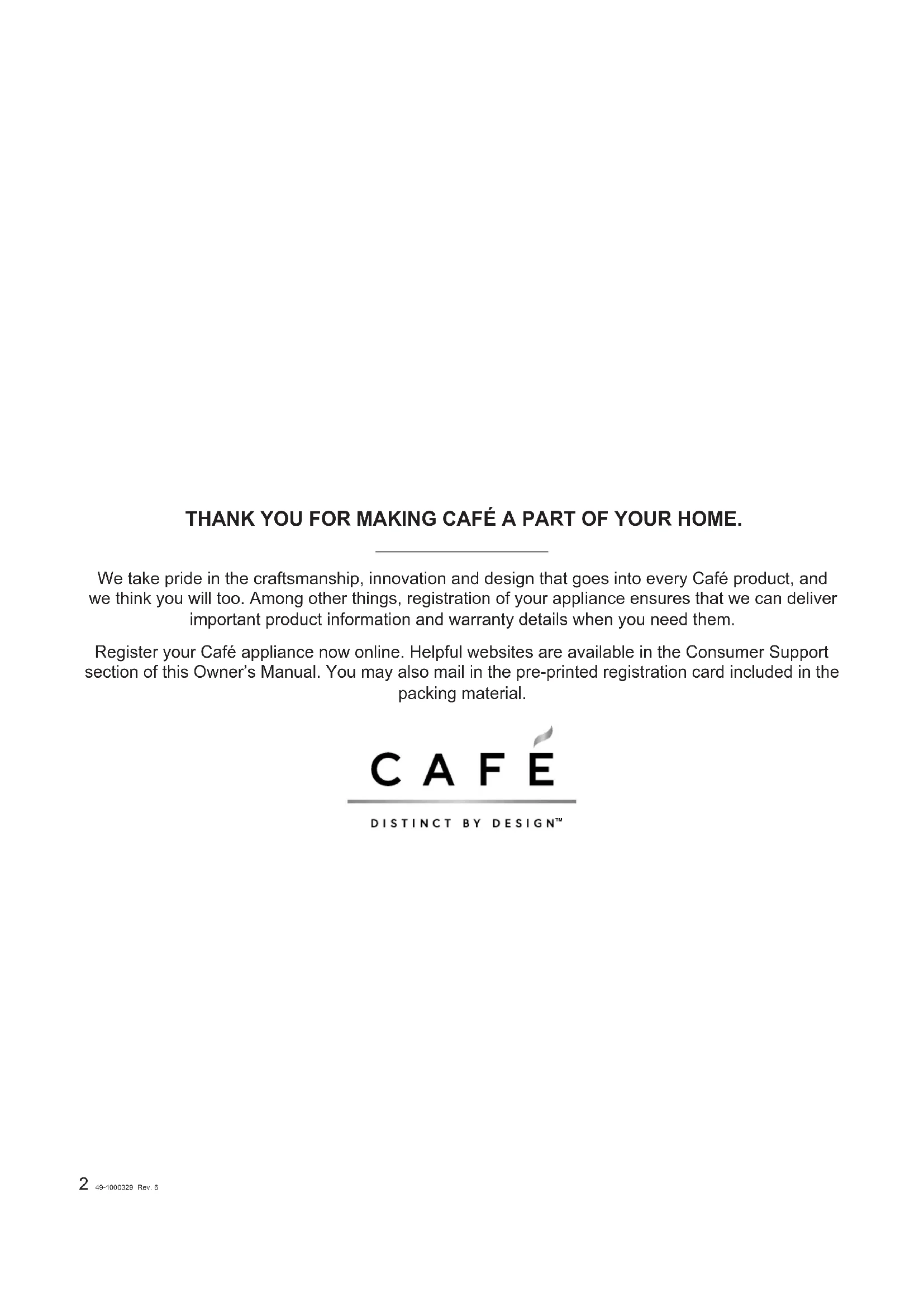 - Consumer Support 49-1000329 Rev. 6 THANK YOU FOR MAKING CAFÉ A PART OF YOUR HOME. We take pride in the craftsmanship, innovation and design that goes into every Café product, and we think you will too. Among other things, registration of your appliance ensures that we can deliver important product information and warranty details when you need them. Register your Café appliance now online. Helpful websites are available in the Consumer Support section of this Owner’s Manual. You may also mail in the pre-printed registration card included in the packing material. TM49-1000329 Rev. 6 3 SAFETY INFORMATION p. 462