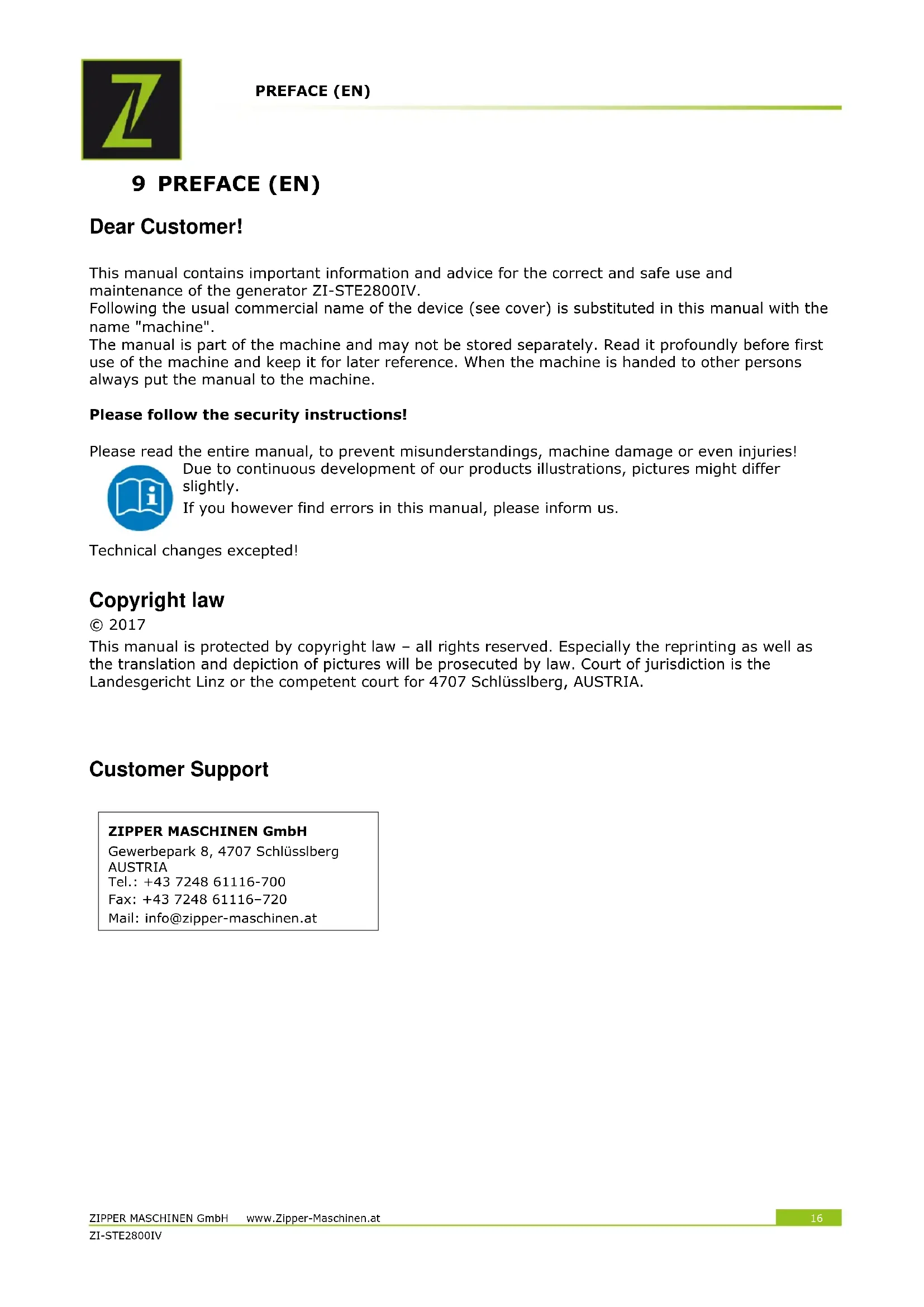 HIN WEIS Sollten sie sich bei notwendigen Reparaturen nicht in der Lage fühlen diese ordnungsgemäß zu verrichten, oder besitzen sie die vorgeschriebene Ausbildung dafür nicht, ziehen sie immer eine Fachwerkstätte zum Beheben des Problems hinzu.PREFACE (EN) ZIPPER MASCHINEN GmbH www.Zipper-Maschinen.at 16 ZI-STE2800IV 9 PREFACE (EN) Dear Customer! This manual contains important information and advice for the correct and safe use and maintenance of the generator ZI-STE2800IV. Following the usual commercial name of the device (see cover) is substituted in this manual with the name "machine". The manual is part of the machine and may not be stored separately. Read it profoundly before first use of the machine and keep it for later reference. When the machine is handed to other persons always put the manual to the machine. Please follow the security instructions! Please read the entire manual, to prevent misunderstandings, machine damage or even injuries! Due to continuous development of our products illustrations, pictures might differ slightly. If you however find errors in this manual, please inform us. Technical changes excepted! Copyright law © 2017 This manual is protected by copyright law – all rights reserved. Especially the reprinting as well as the translation and depiction of pictures will be prosecuted by law. Court of jurisdiction is the Landesgericht Linz or the competent court for 4707 Schlüsslberg, AUSTRIA.