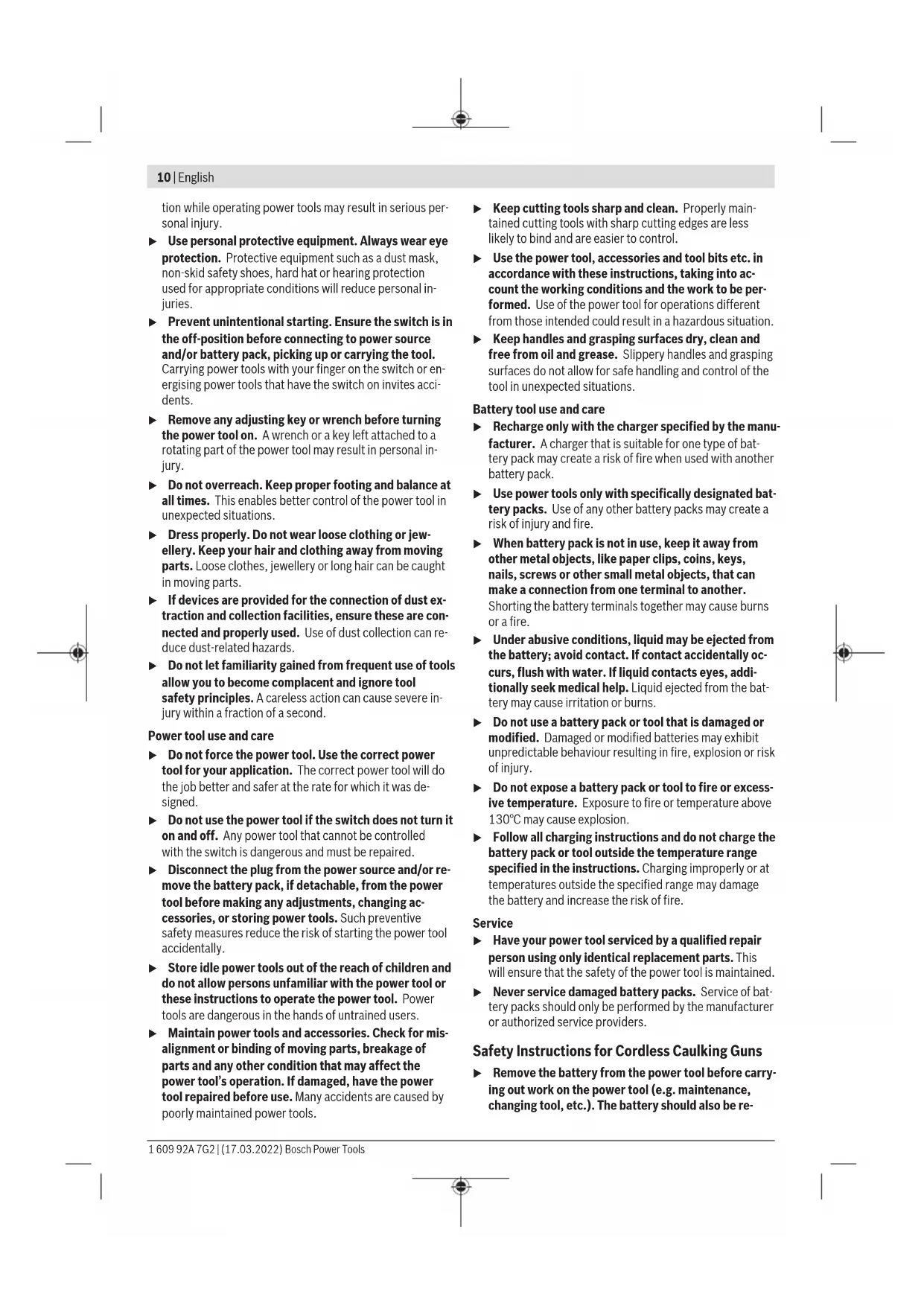 and during storage °C −15…+50 Recommended rechargeable batteries GBA 18V.… ProCORE18V… Bosch Power Tools 1 609 92A 7G2 | (17.03.2022)12 | English Cordless caulking gun GCG 18V-310 Recommended chargers GAL 18… GAX 18… GAL 36… A) Depends on battery in use B) Limited performance at temperatures <0°C Noise/Vibration Information Noise emission values determined according to EN62841-1. Typically the A-weighted sound pressure level of the product is less than 70 dB(A). The noise level when working can ex- ceed the declared values. Wear hearing protection! Total vibration values a