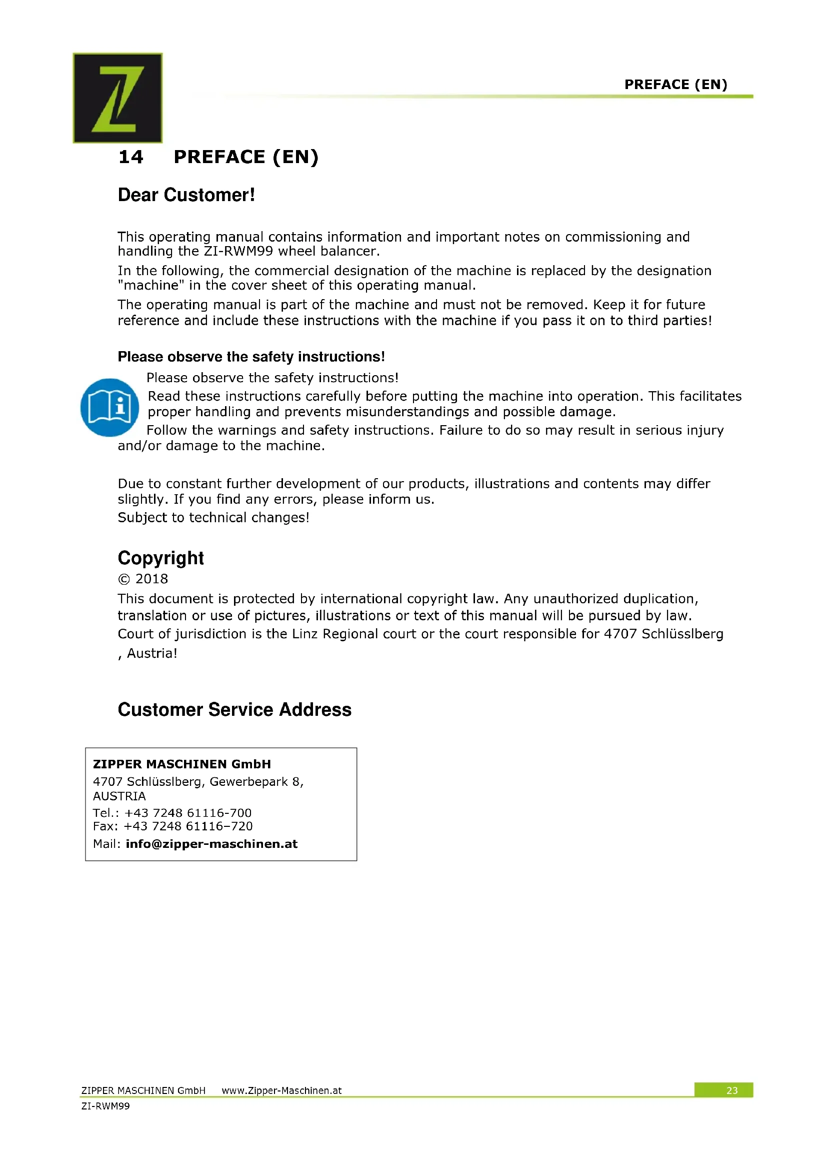 WARNING This type of safety information indicates a potentially dangerous situation which, if not avoided, could result in serious injury or even death.GETTING STARTED ZIPPER MASCHINEN GmbH www.Zipper-Maschinen.at 25 ZI-RWM99