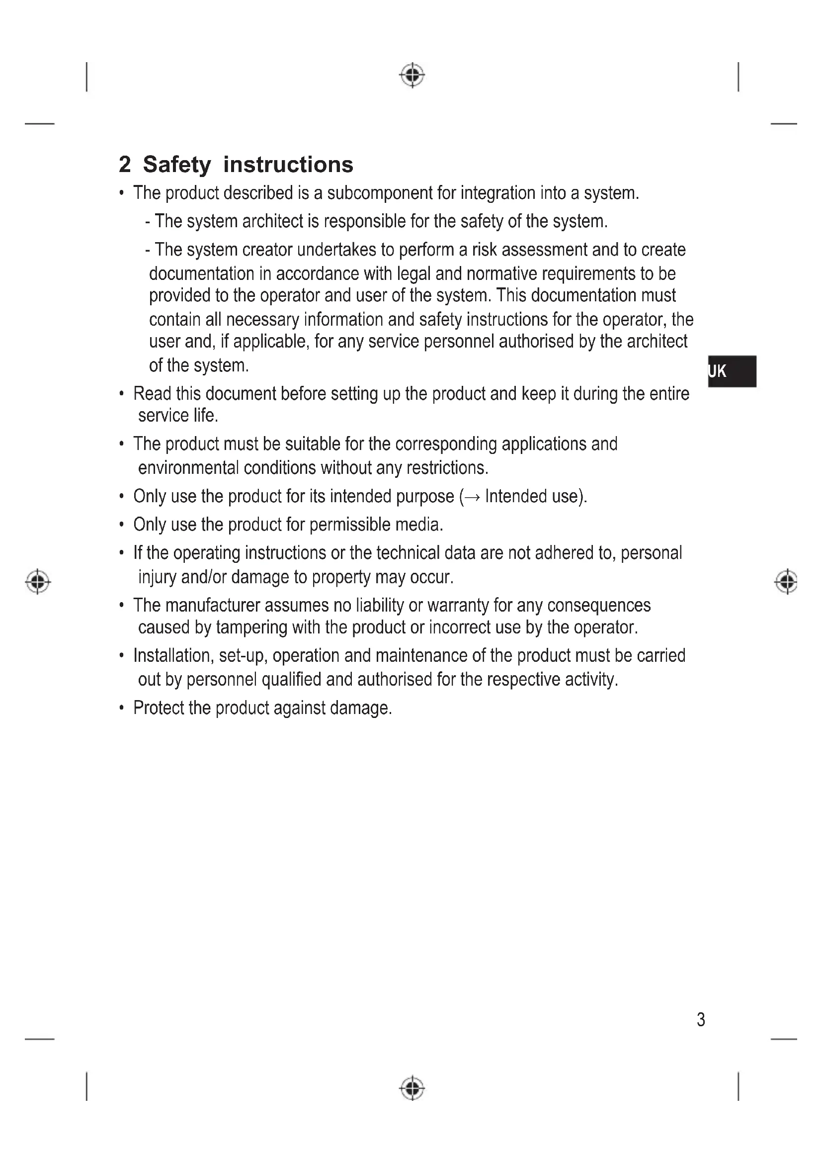 - The product described is a subcomponent for integration into a system. - The system architect is responsible for the safety of the system. - The system creator undertakes to perform a risk assessment and to create documentation in accordance with legal and normative requirements to be provided to the operator and user of the system. This documentation must contain all necessary information and safety instructions for the operator, the user and, if applicable, for any service personnel authorised by the architect of the system.