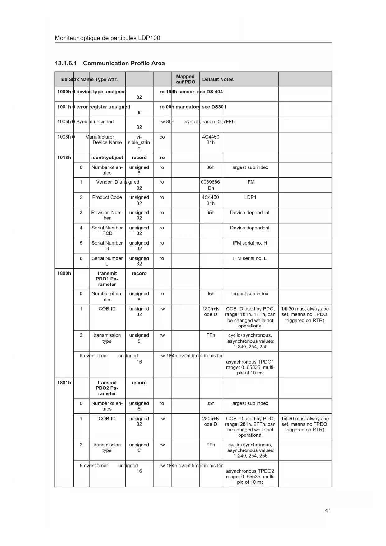 ro IFM serial no. L 1800h transmit PDO1 Pa- rameter record 0 Number of en- tries unsigned