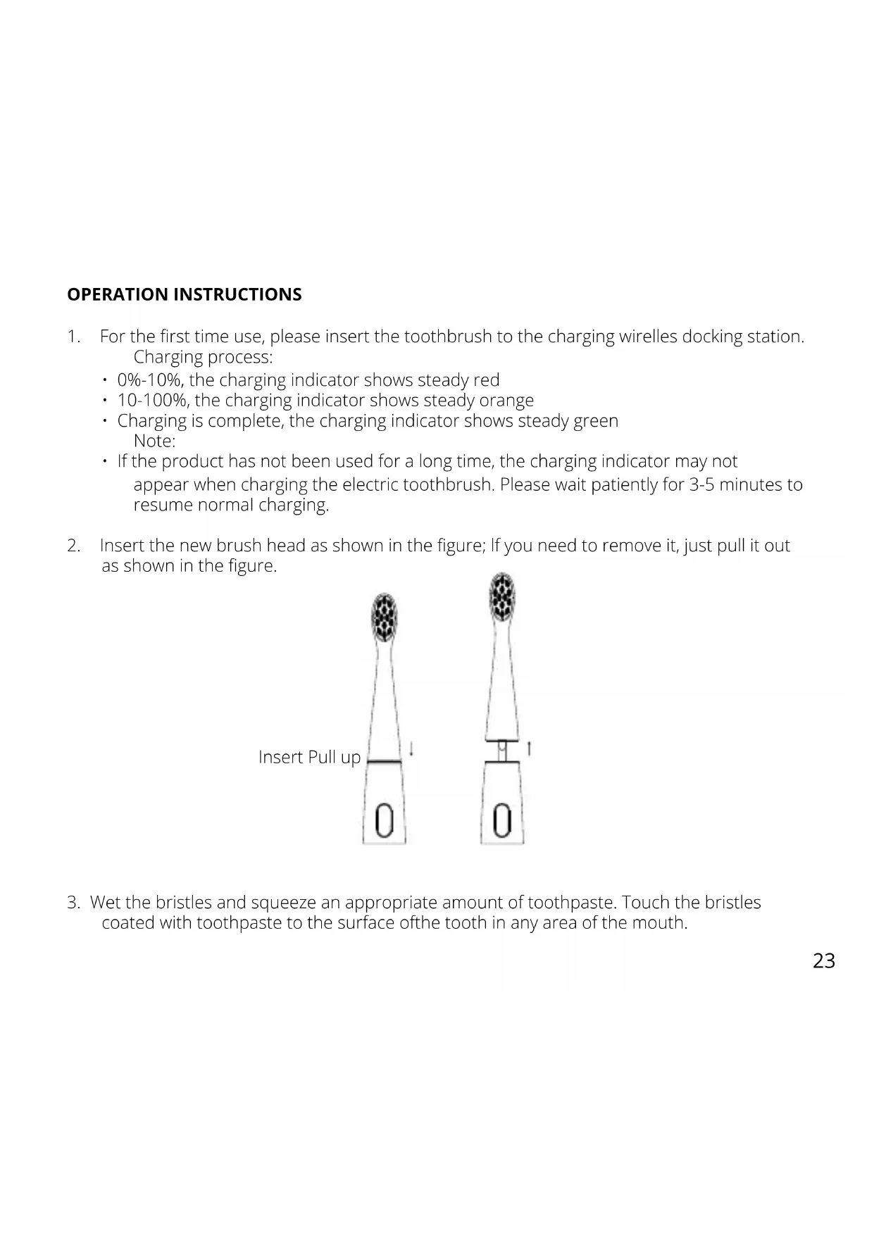 1. For the rst time use, please insert the toothbrush to the charging wirelles docking station.