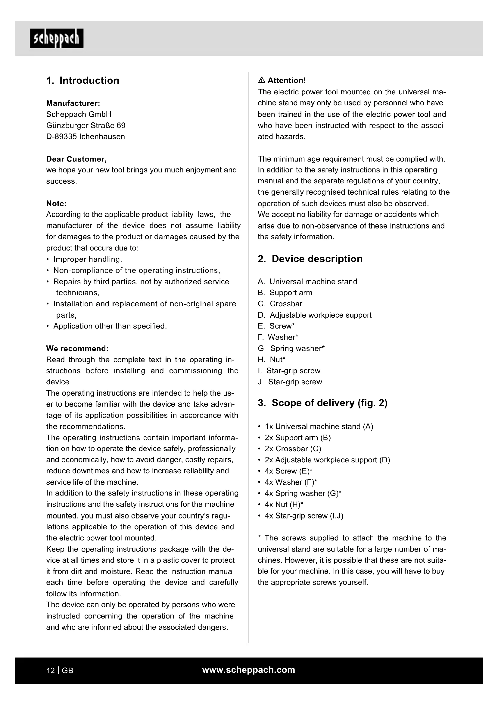 - Application other than specied. We recommend: Read through the complete text in the operating in- structions before installing and commissioning the device. The operating instructions are intended to help the us- er to become familiar with the device and take advan- tage of its application possibilities in accordance with the recommendations. The operating instructions contain important informa- tion on how to operate the device safely, professionally and economically, how to avoid danger, costly repairs, reduce downtimes and how to increase reliability and service life of the machine. In addition to the safety instructions in these operating instructions and the safety instructions for the machine mounted, you must also observe your country’s regu- lations applicable to the operation of this device and the electric power tool mounted. Keep the operating instructions package with the de- vice at all times and store it in a plastic cover to protect it from dirt and moisture. Read the instruction manual each time before operating the device and carefully follow its information. The device can only be operated by persons who were instructed concerning the operation of the machine and who are informed about the associated dangers.www.scheppach.com