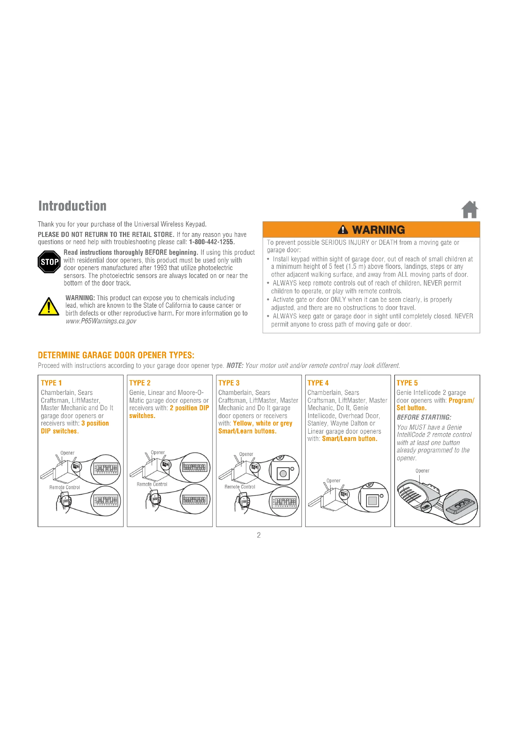 - ALWAYS keep gate or garage door in sight until completely closed. NEVER permit anyone to cross path of moving gate or door. Introduction Thank you for your purchase of the Universal Wireless Keypad. PLEASE DO NOT RETURN TO THE RETAIL STORE. If for any reason you have questions or need help with troubleshooting please call: 1-800-442-1255. Read instructions thoroughly BEFORE beginning. If using this product with residential door openers, this product must be used only with door openers manufactured after 1993 that utilize photoelectric sensors. The photoelectric sensors are always located on or near the bottom of the door track. DETERMINE GARAGE DOOR OPENER TYPES: Proceed with instructions according to your garage door opener type. NOTE: Your motor unit and/or remote control may look different. TYPE 4 Chamberlain, Sears Craftsman, LiftMaster, Master Mechanic, Do It, Genie Intellicode, Overhead Door, Stanley, Wayne Dalton or Linear garage door openers with: Smart/Learn button. TYPE 5 Genie Intellicode 2 garage door openers with: Program/ Set button. BEFORE STARTING: You MUST have a Genie IntelliCode 2 remote control with at least one button already programmed to the opener. TYPE 2 Genie, Linear and Moore-O- Matic garage door openers or receivers with: 2 position DIP switches.