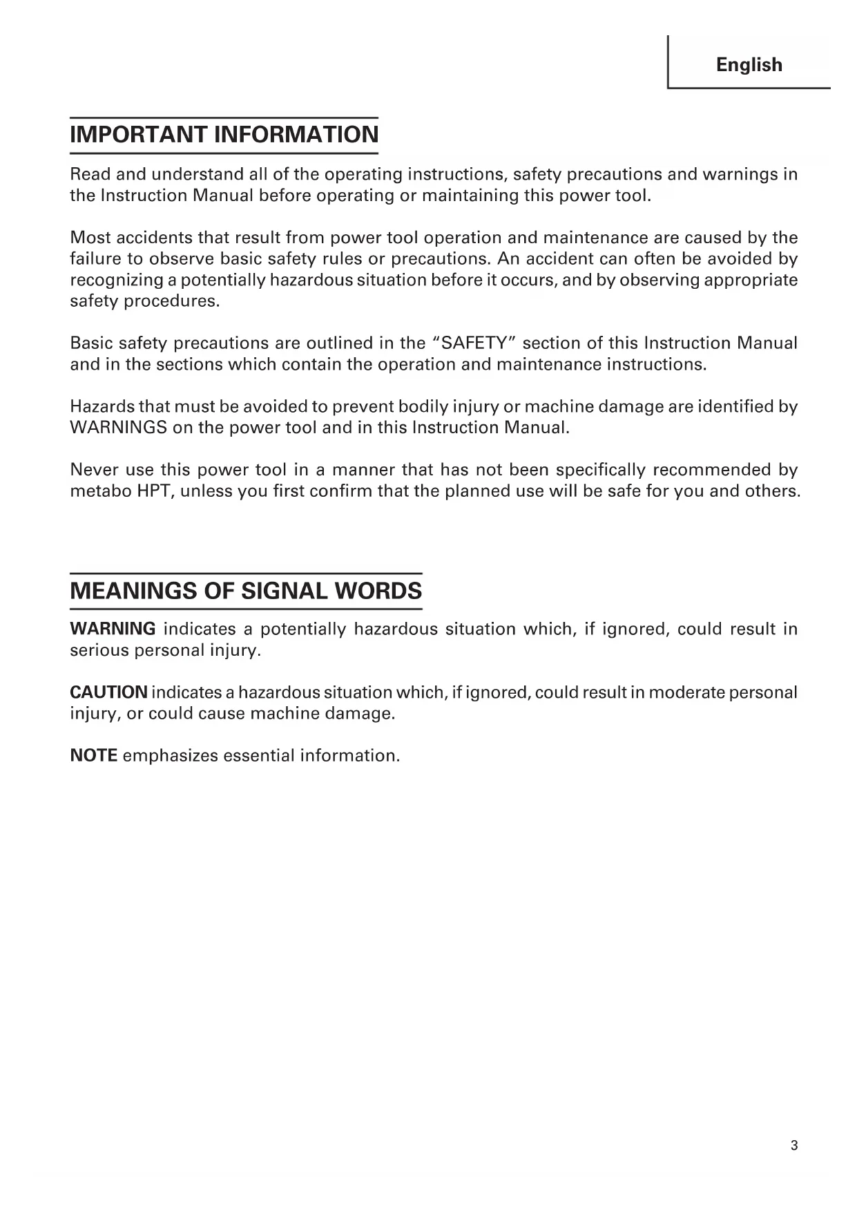 IMPORTANT INFORMATION Read and understand all of the operating instructions, safety precautions and warnings in the Instruction Manual before operating or maintaining this power tool. Most accidents that result from power tool operation and maintenance are caused by the failure to observe basic safety rules or precautions. An accident can often be avoided by recognizing a potentially hazardous situation before it occurs, and by observing appropriate safety procedures. Basic safety precautions are outlined in the “SAFETY” section of this Instruction Manual and in the sections which contain the operation and maintenance instructions. Hazards that must be avoided to prevent bodily injury or machine damage are identified by WARNINGS on the power tool and in this Instruction Manual. Never use this power tool in a manner that has not been specifically recommended by metabo HPT, unless you first confirm that the planned use will be safe for you and others.