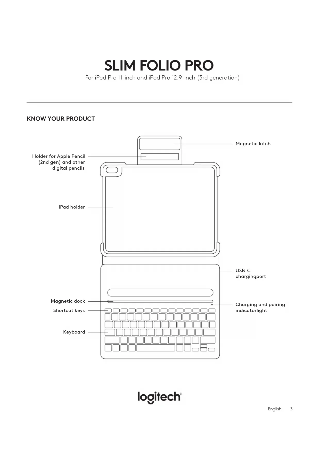 Holder for Apple Pencil (2nd gen) and other digital pencils Magnetic latch USB-C charging port Charging and pairing indicator light iPad holder Magnetic dock Shortcut keys KeyboardEnglish 4