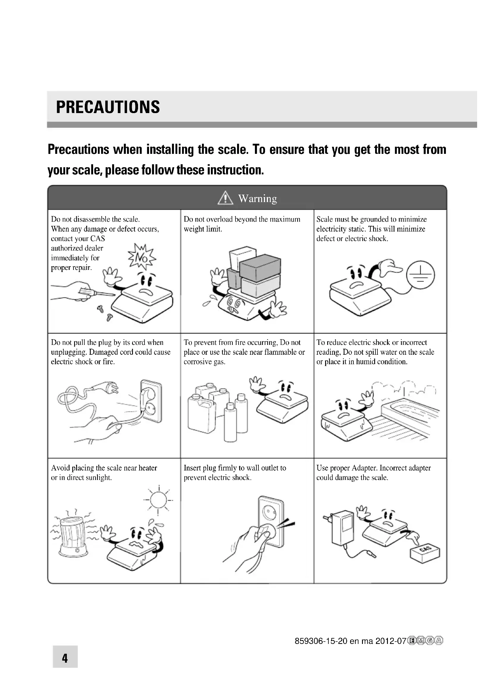 | Do not disassemble the scale. When any damage or defect occurs, contact your CAS authorized dealer immediately for proper repair. | Do not overload beyond the maximum weight limit. | Scale must be grounded to minimize electricity static. This will minimize defect or electric shock. |