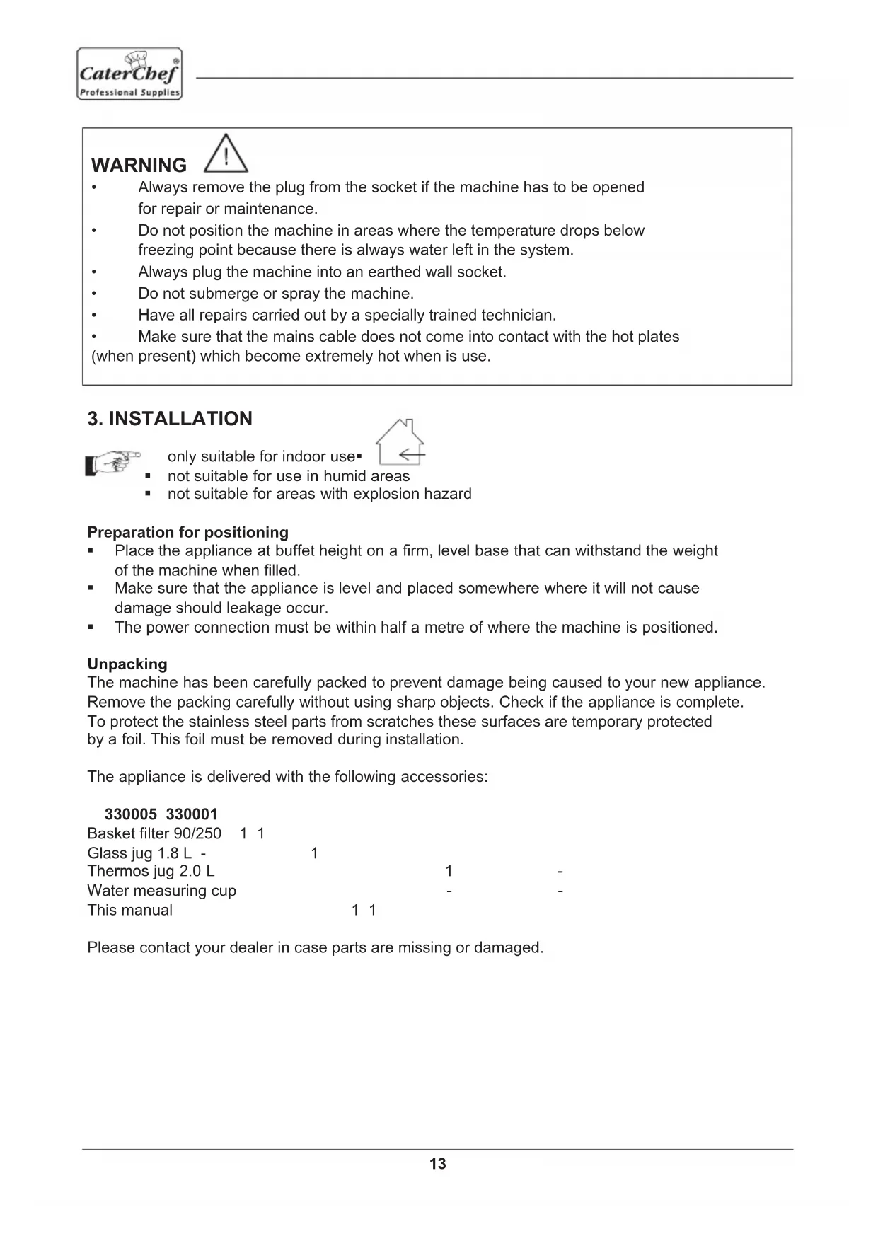 Download the instructions for your Coffee machine in PDF format for free! Find your manual 330002 - CaterChef and take your electronic device back in hand. On this page are published all the documents necessary for the use of your device. 330002 by CaterChef.