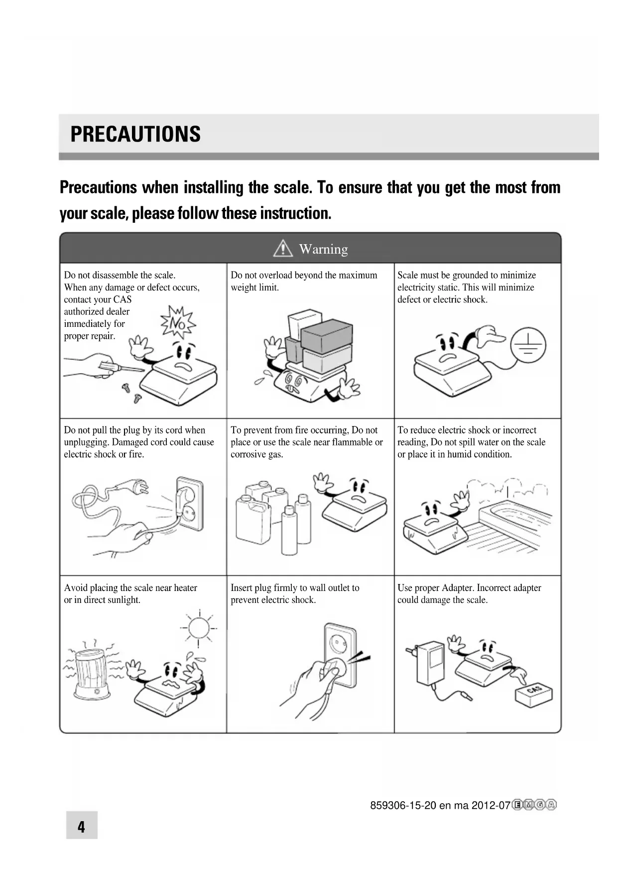 BATTERY MAINTENACE 14 ERROR MESSAGE 14 SPECIFICATIONS 15 859306-15-20 en ma 2012-074 Do not disassemble the scale. When any damage or defect occurs, contact your CAS authorized dealer immediately for proper repair. Do not overload beyond the maximum weight limit. Do not pull the plug by its cord when unplugging. Damaged cord could cause electric shock or fire. To prevent from fire occurring, Do not place or use the scale near flammable or corrosive gas. Avoid placing the scale near heater or in direct sunlight. Scale must be grounded to minimize electricity static. This will minimize defect or electric shock. Use proper Adapter. Incorrect adapter could damage the scale. Insert plug firmly to wall outlet to prevent electric shock. To reduce electric shock or incorrect reading, Do not spill water on the scale or place it in humid condition. Warning PRECAUTIONS Precautions when installing the scale. To ensure that you get the most from your scale, please follow these instruction. 859306-15-20 en ma 2012-075 For consistent and accurate reading, maintain periodical check by your CAS authorized dealer. Avoid sudden shock to the scale. Internal mechanism could be damaged. Take the battery out when scale is not in use for long time. Leakage from the batteries is hazardous. Place the scale on firm and temperature consistent environment. Keep the scale away from other electromagnetic generating devices. This may interfere with accurate reading. Grab on the bottom of the scale when moving. Do not hold by the platter. By adjusting 4 corners of the scale, set the scale even using the built in scale leveling indicator. Attention Make sure to plug your scale into the proper power outlet. For maximum performance, plug into a power outlet 30 minutes before the usage for warm up. 859306-15-20 en ma 2012-076 PREFACE