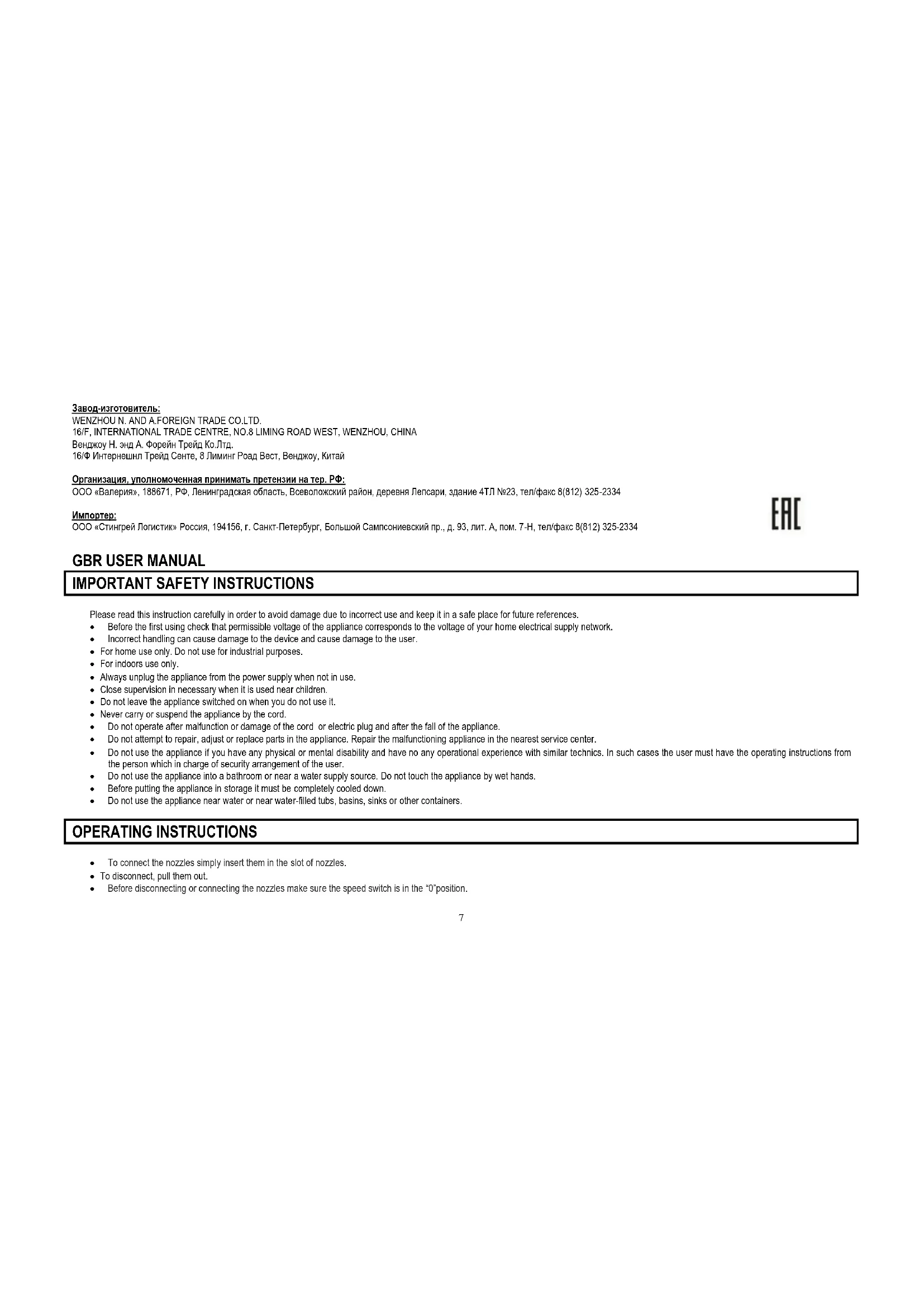Before the first using check that permissible voltage of the appliance corresponds to the voltage of your home electrical supply network.