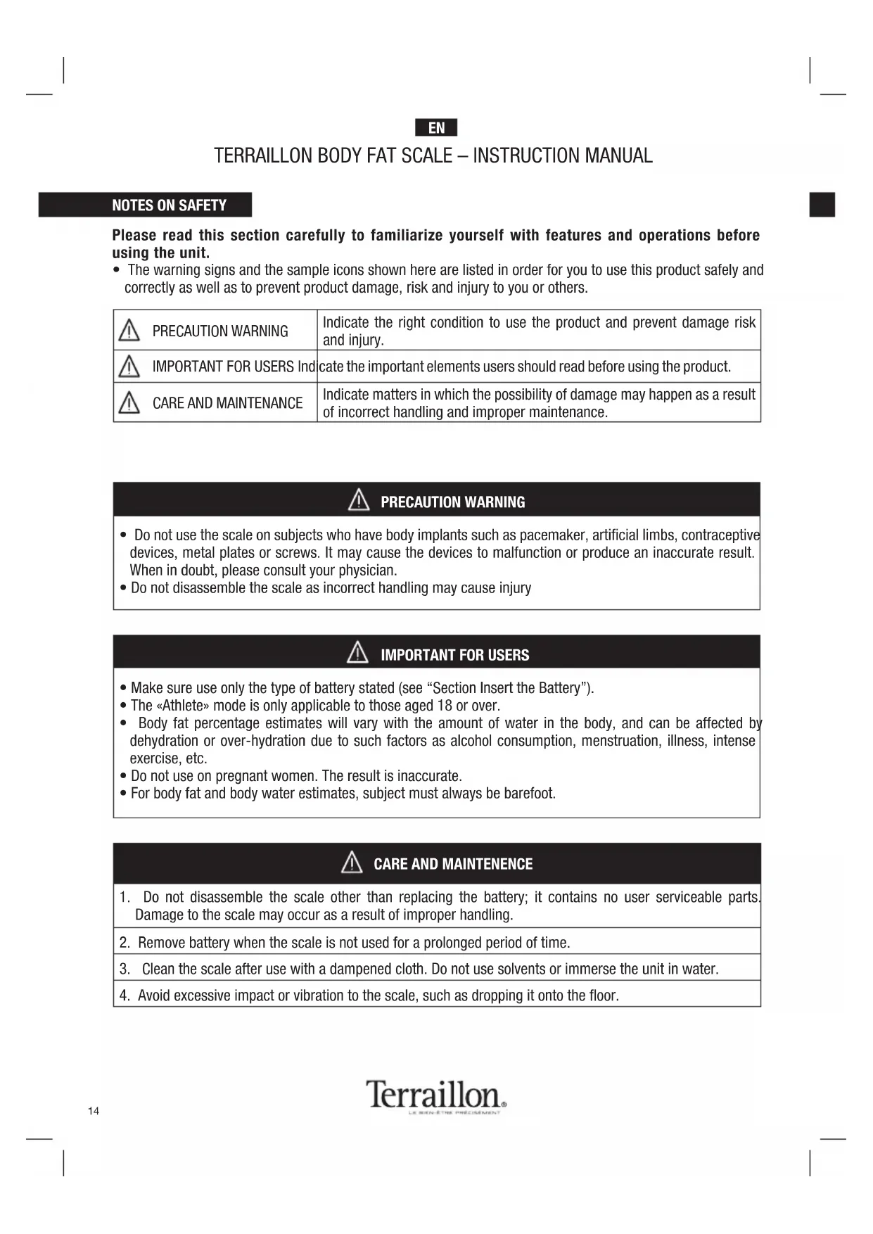 - Do not disassemble the scale as incorrect handling may cause injury PRECAUTION WARNING